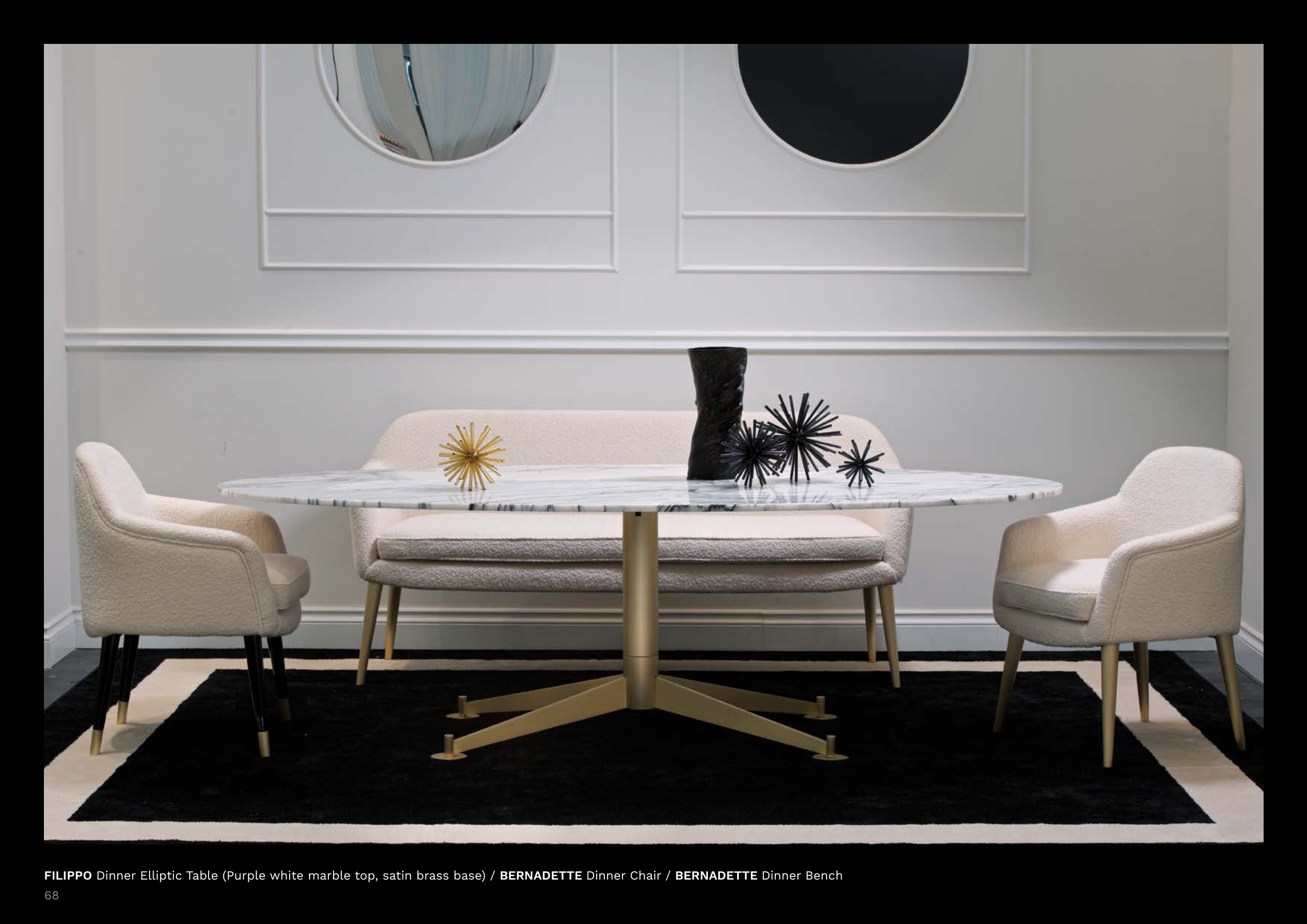 FILIPPO Dinner Elliptic Table (Purple white marble top, satin brass base) / BERNADETTE Dinner Chair / BERNADETTE Dinner Bench