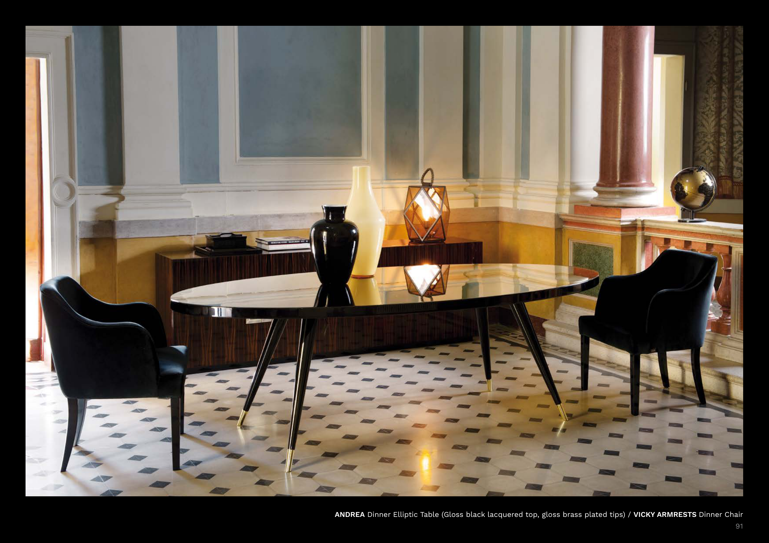 ANDREA Dinner Elliptic Table (Gloss black lacquered top, gloss brass plated tips) / VICKY ARMRESTS Dinner Chair