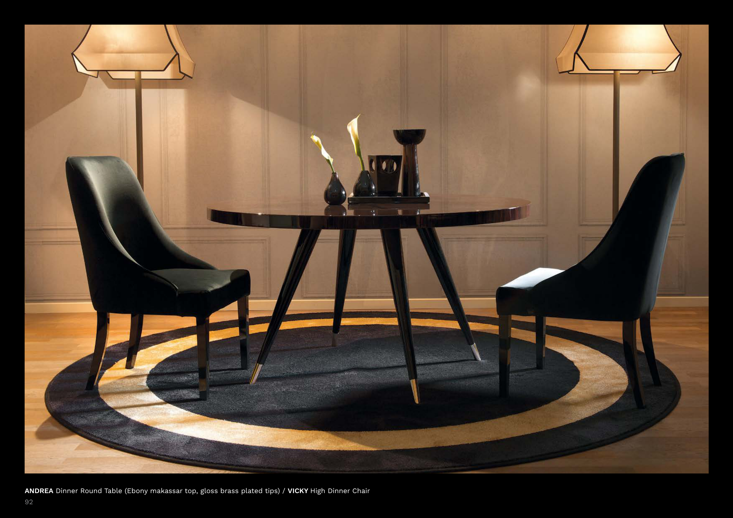 ANDREA Dinner Round Table (Ebony makassar top, gloss brass plated tips) / VICKY High Dinner Chair