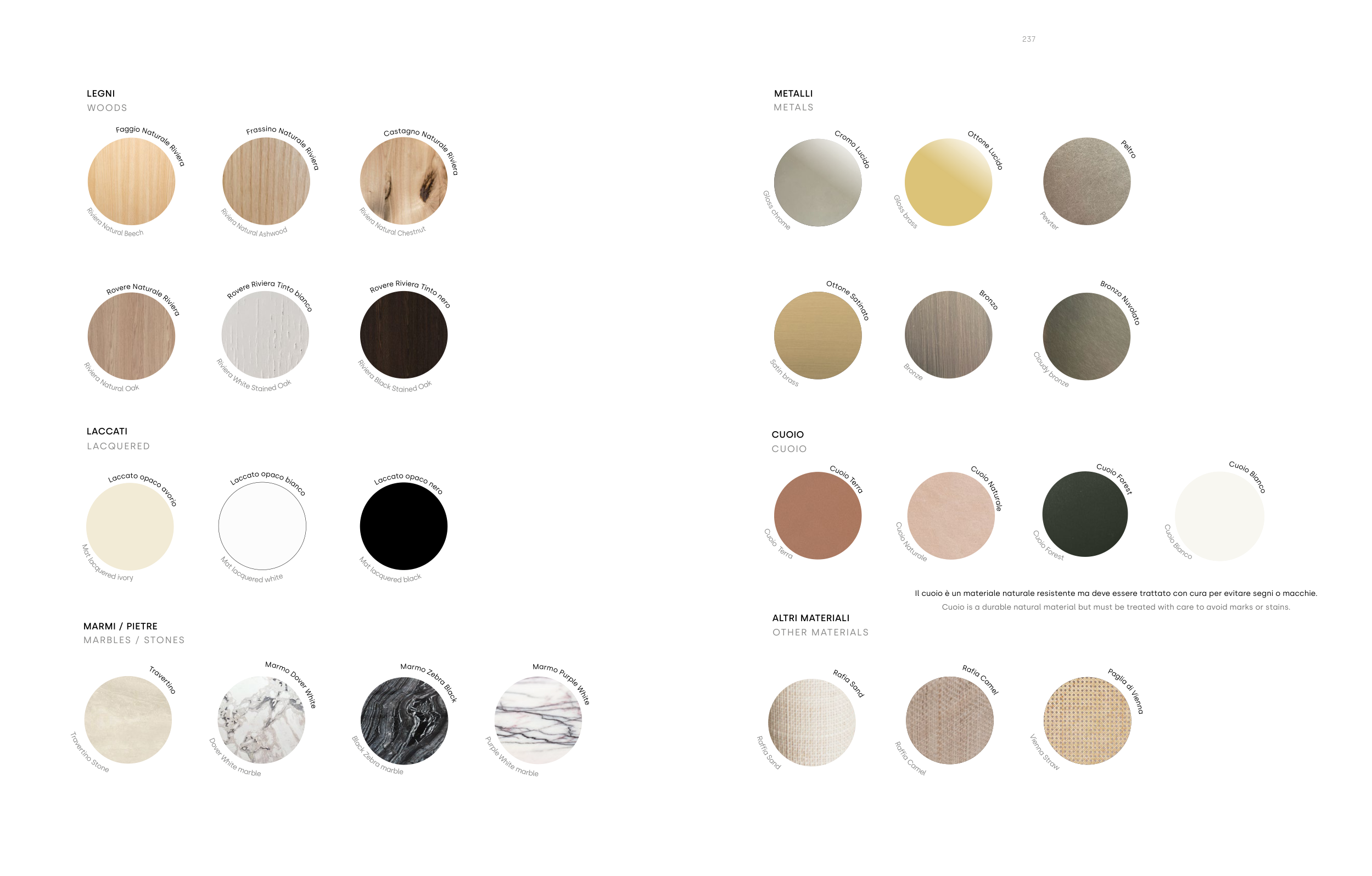 Cuoio is a durable natural material but must be treated with care to avoid marks or stains.