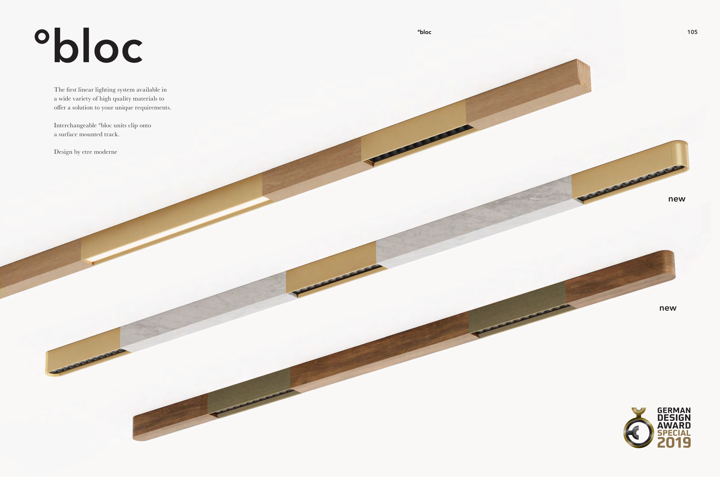 °bloc The first linear lighting system available in a wide variety of high quality materials to offer a solution to your unique requirements. Interchangeable °bloc units clip onto a surface mounted track. Design by etre moderne °bloc 105 new new