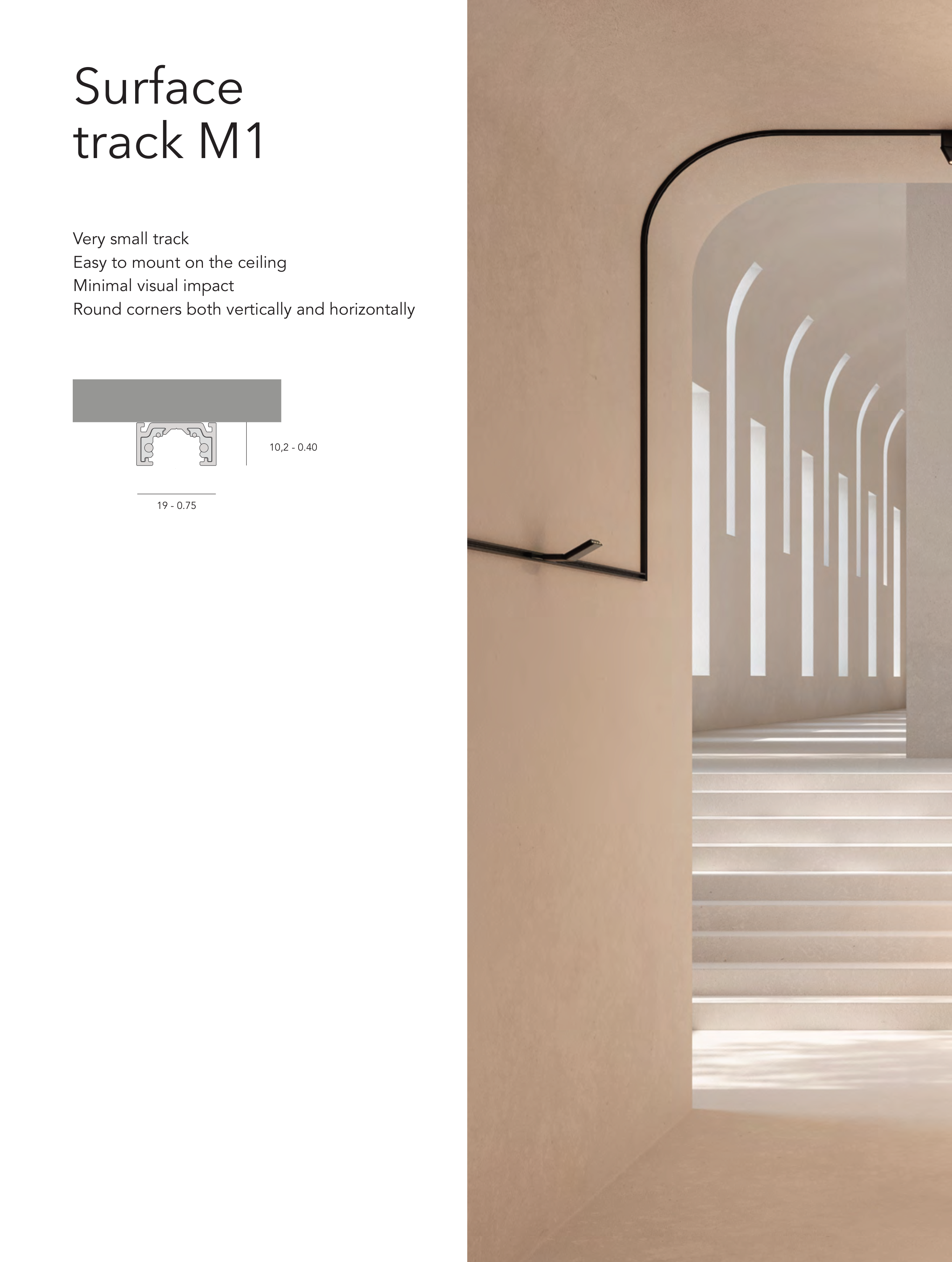 Surface track M1 Very small track Easy to mount on the ceiling Minimal visual impact Round corners both vertically and horizontally Data BUS 60V dc - + 10.2 [0.40”] 11.2 [0.44”] 19 [0.75”] 19 - 0.75 10,2 - 0.40