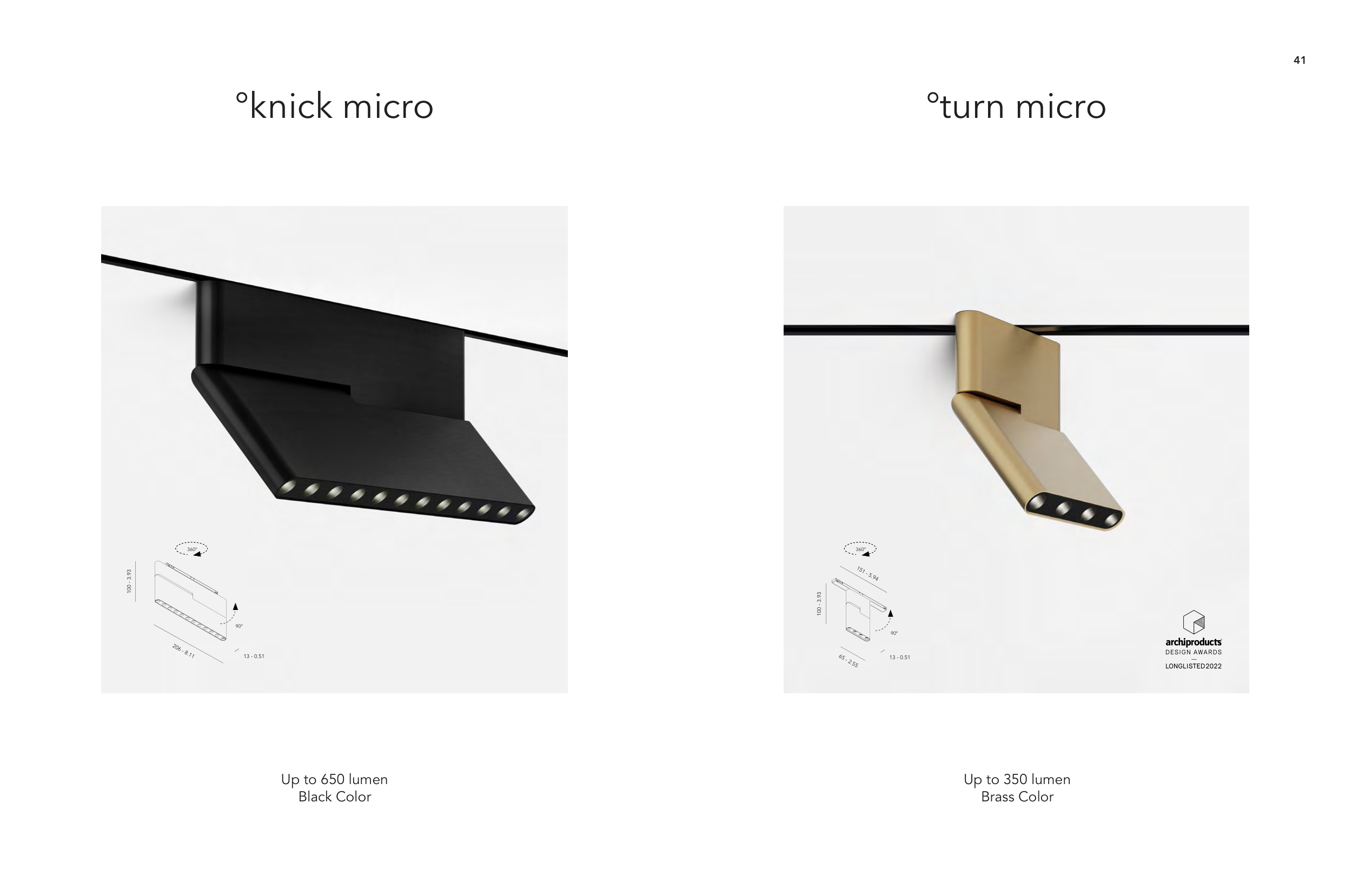 °knick micro °turn micro 90° 206 - 8.11 1 A 2 3 4 5 6 7 8 1 2 3 4 5 6 7 8 B C D E F A B C D E F 360° 100 - 3.93 13 - 0.51 90° 65 - 2.55 100 - 3.93 1 A 2 3 4 5 6 7 8 1 2 3 4 5 6 7 8 B C D E F A B C D E F 360° 13 - 0.51 151 - 5.94 41 Up to 650 lumen Black Color Up to 350 lumen Brass Color