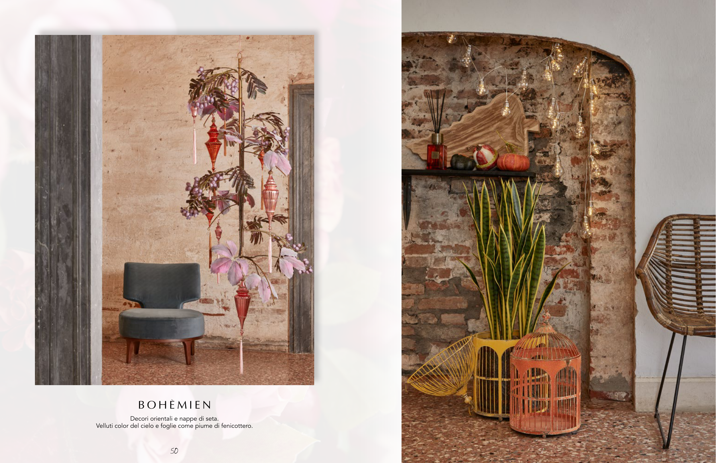 Velluti color del cielo e foglie come piume di fenicottero.