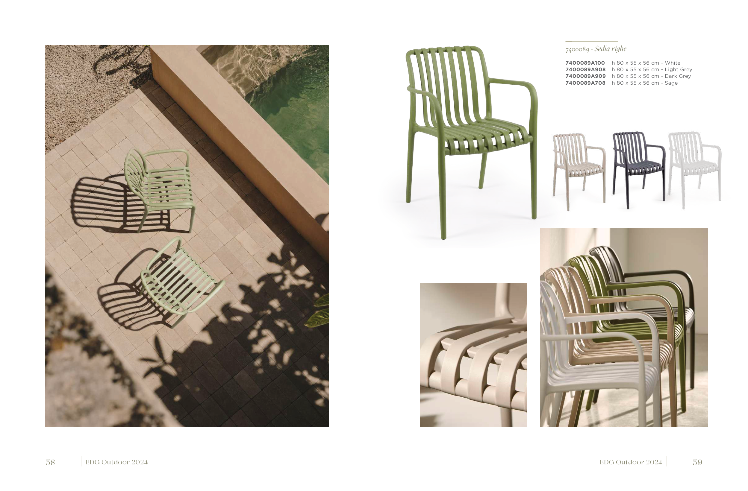 EDG Outdoor 2024 58 EDG Outdoor 2024 59 7400089 - Sedia righe 7400089A100 h 80 x 55 x 56 cm - White 7400089A908 h 80 x 55 x 56 cm - Light Grey 7400089A909 h 80 x 55 x 56 cm - Dark Grey 7400089A708 h 80 x 55 x 56 cm - Sage