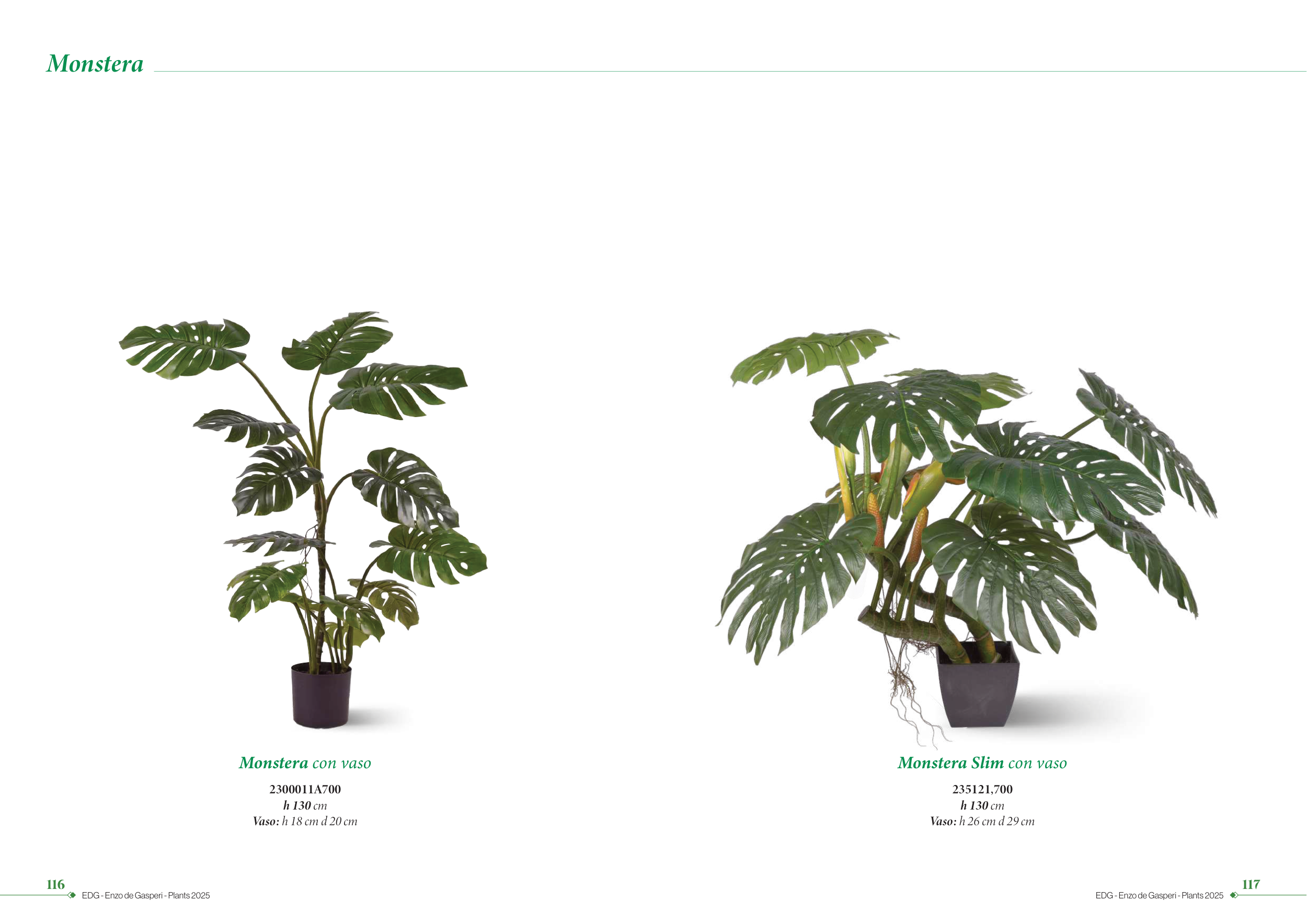 116 EDG - Enzo de Gasperi - Plants 2025 117 EDG - Enzo de Gasperi - Plants 2025 Monstera Monstera con vaso 2300011A700 h 130 cm Vaso: h 18 cm d 20 cm Monstera Slim con vaso 235121,700 h 130 cm Vaso: h 26 cm d 29 cm