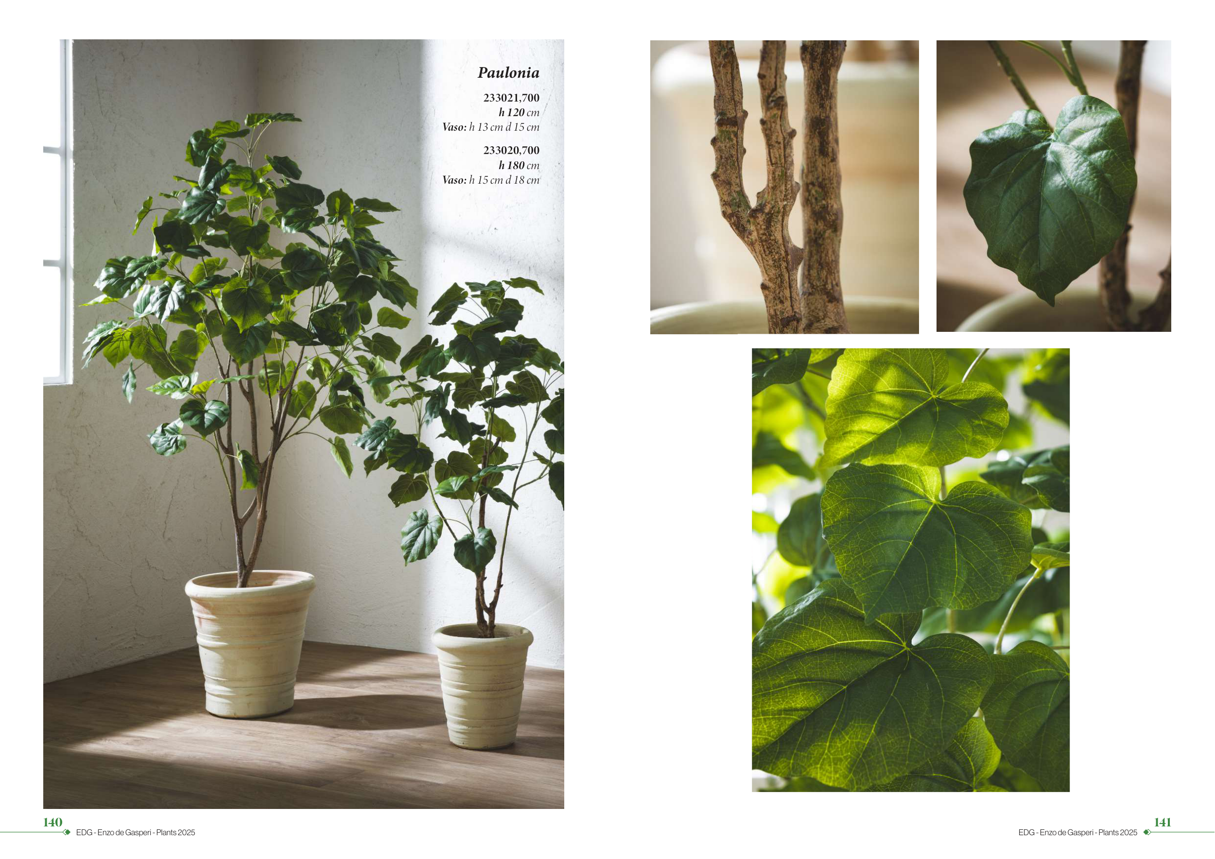 140 EDG - Enzo de Gasperi - Plants 2025 141 EDG - Enzo de Gasperi - Plants 2025 Paulonia 233021,700 h 120 cm Vaso: h 13 cm d 15 cm 233020,700 h 180 cm Vaso: h 15 cm d 18 cm