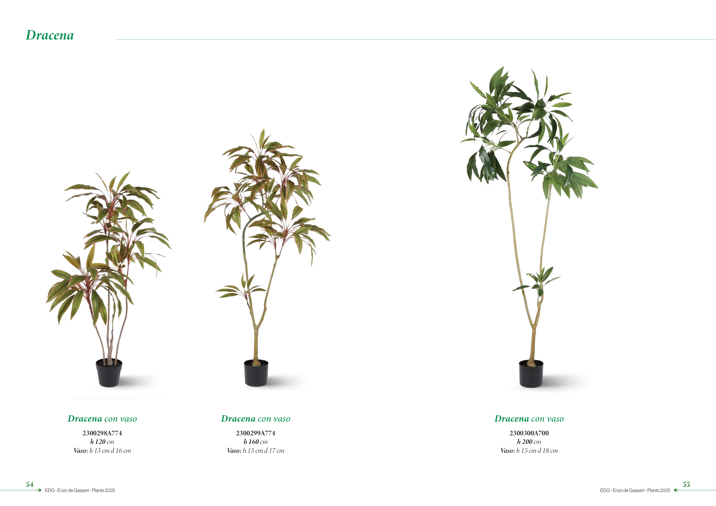 54 EDG - Enzo de Gasperi - Plants 2025 55 EDG - Enzo de Gasperi - Plants 2025 Dracena con vaso 2300299A774 h 160 cm Vaso: h 15 cm d 17 cm Dracena con vaso 2300298A774 h 120 cm Vaso: h 13 cm d 16 cm Dracena Dracena con vaso 2300300A700 h 200 cm Vaso: h 15 cm d 18 cm