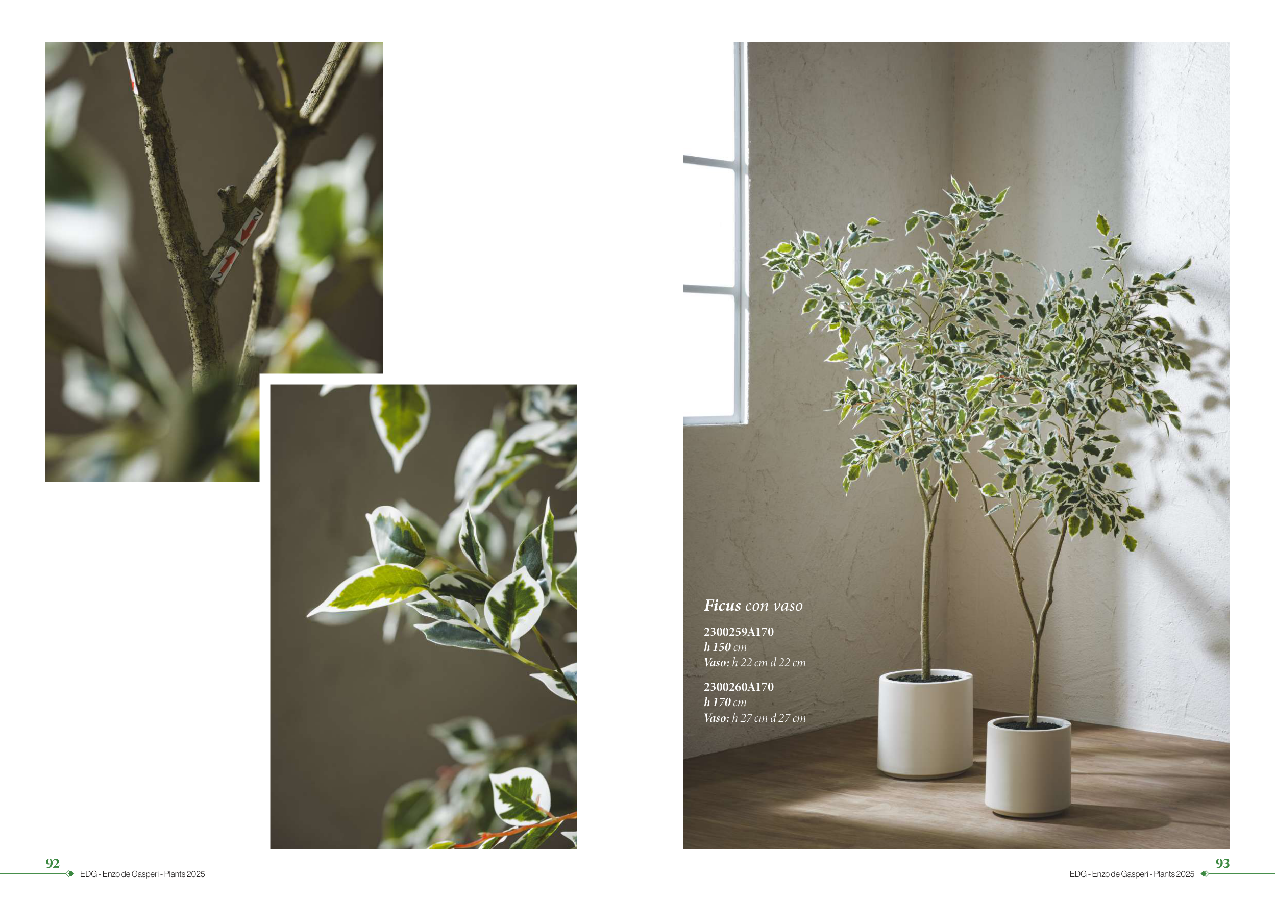 92 EDG - Enzo de Gasperi - Plants 2025 93 EDG - Enzo de Gasperi - Plants 2025 Ficus con vaso 2300259A170 h 150 cm Vaso: h 22 cm d 22 cm 2300260A170 h 170 cm Vaso: h 27 cm d 27 cm