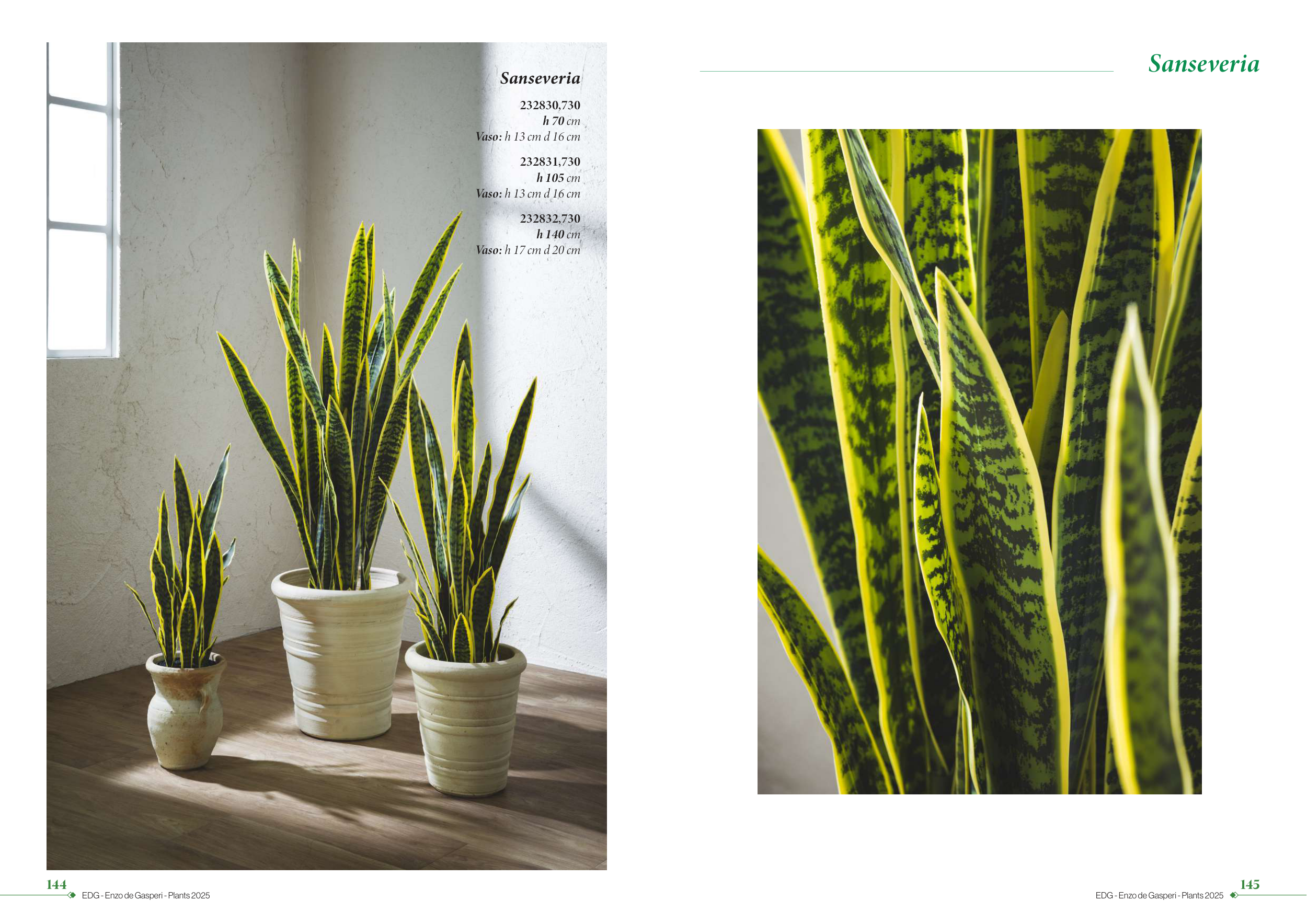 144 EDG - Enzo de Gasperi - Plants 2025 145 EDG - Enzo de Gasperi - Plants 2025 Sanseveria 232830,730 h 70 cm Vaso: h 13 cm d 16 cm 232831,730 h 105 cm Vaso: h 13 cm d 16 cm 232832,730 h 140 cm Vaso: h 17 cm d 20 cm Sanseveria