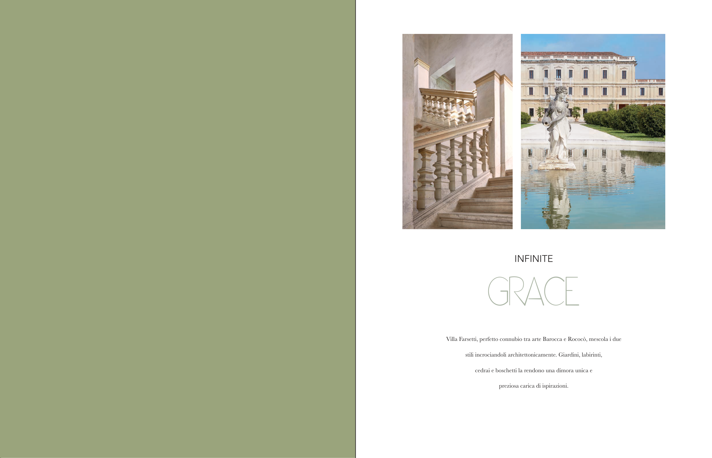 INFINITE GRACE Villa Farsetti, perfetto connubio tra arte Barocca e Rococò, mescola i due stili incrociandoli architettonicamente. Giardini, labirinti, cedrai e boschetti la rendono una dimora unica e preziosa carica di ispirazioni.