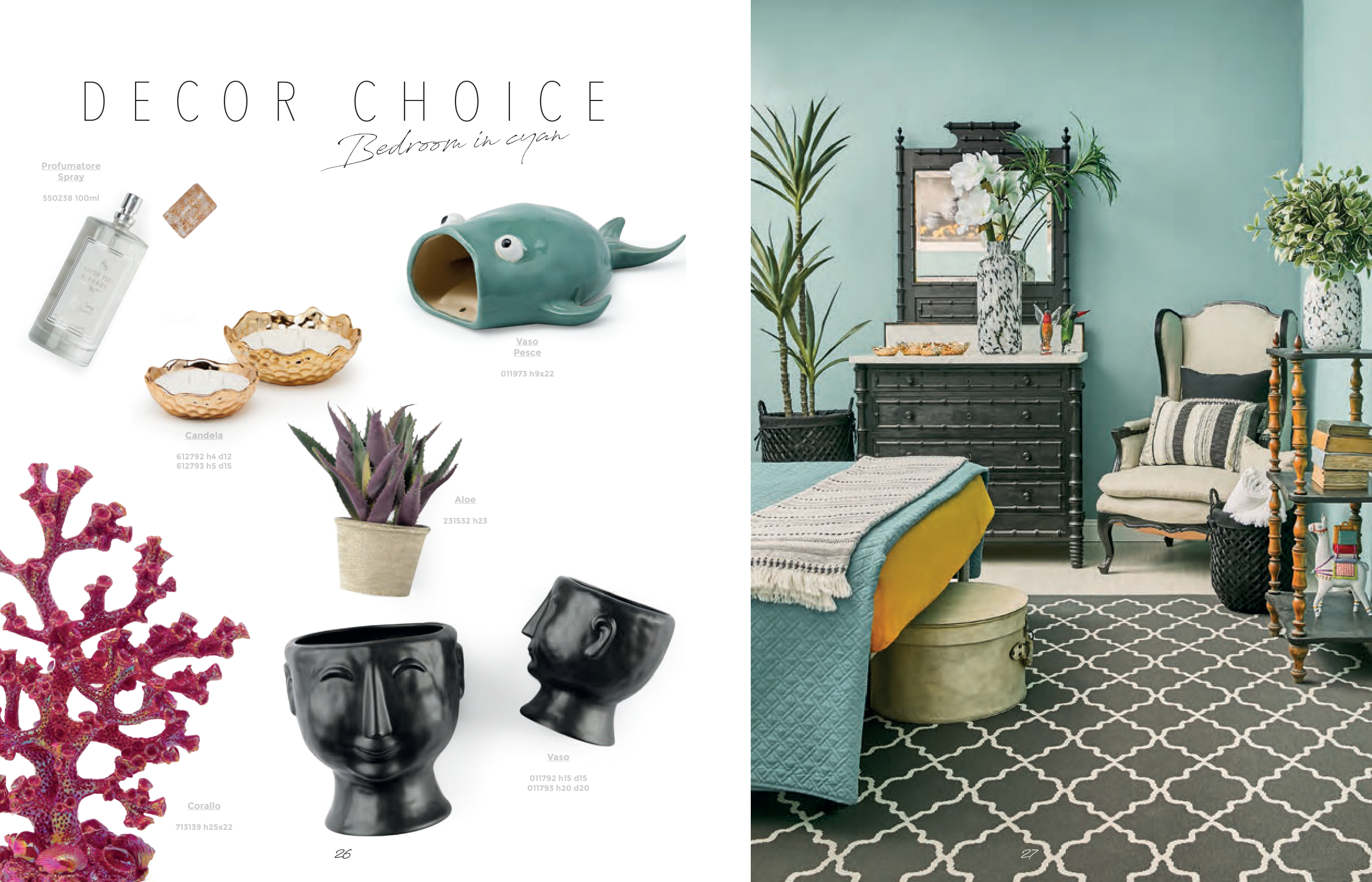 D E C O R C H O I C E Bedroom in cyan Vaso Pesce 011973 h9x22 Corallo 713139 h25x22 Profumatore Spray 550238 100ml Aloe 231532 h23 Vaso 011792 h15 d15 011793 h20 d20 Candela 612792 h4 d12 612793 h5 d15 27 26