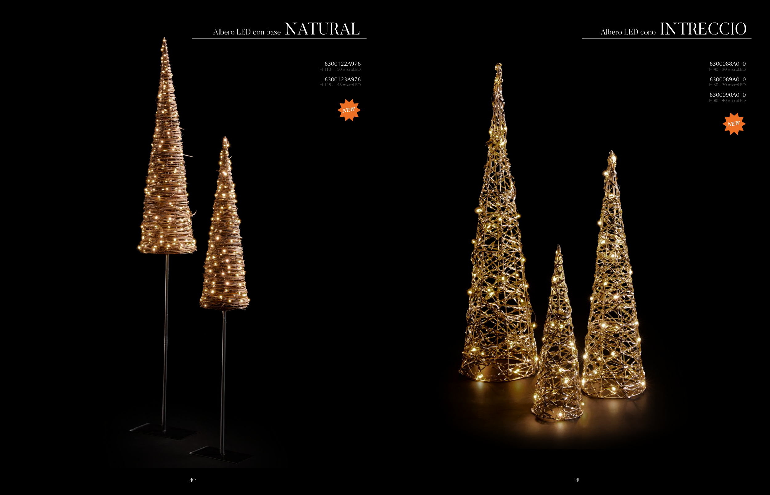 6300122A976 H 110 - 150 microLED 6300123A976 H 148 - 148 microLED Albero LED con base NATURAL 6300088A010 H 40 - 20 microLED 6300089A010 H 60 - 30 microLED 6300090A010 H 80 - 40 microLED Albero LED cono INTRECCIO NEW NEW 40 41