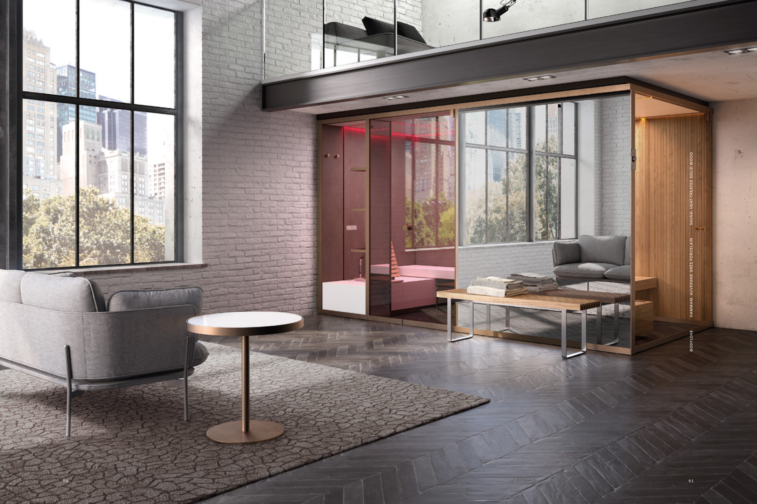 BODYLOVE HAMMAM: AUVERGNE GRÈS PORCELAIN SAUNA: HEAT-TREATED SOLID WOOD