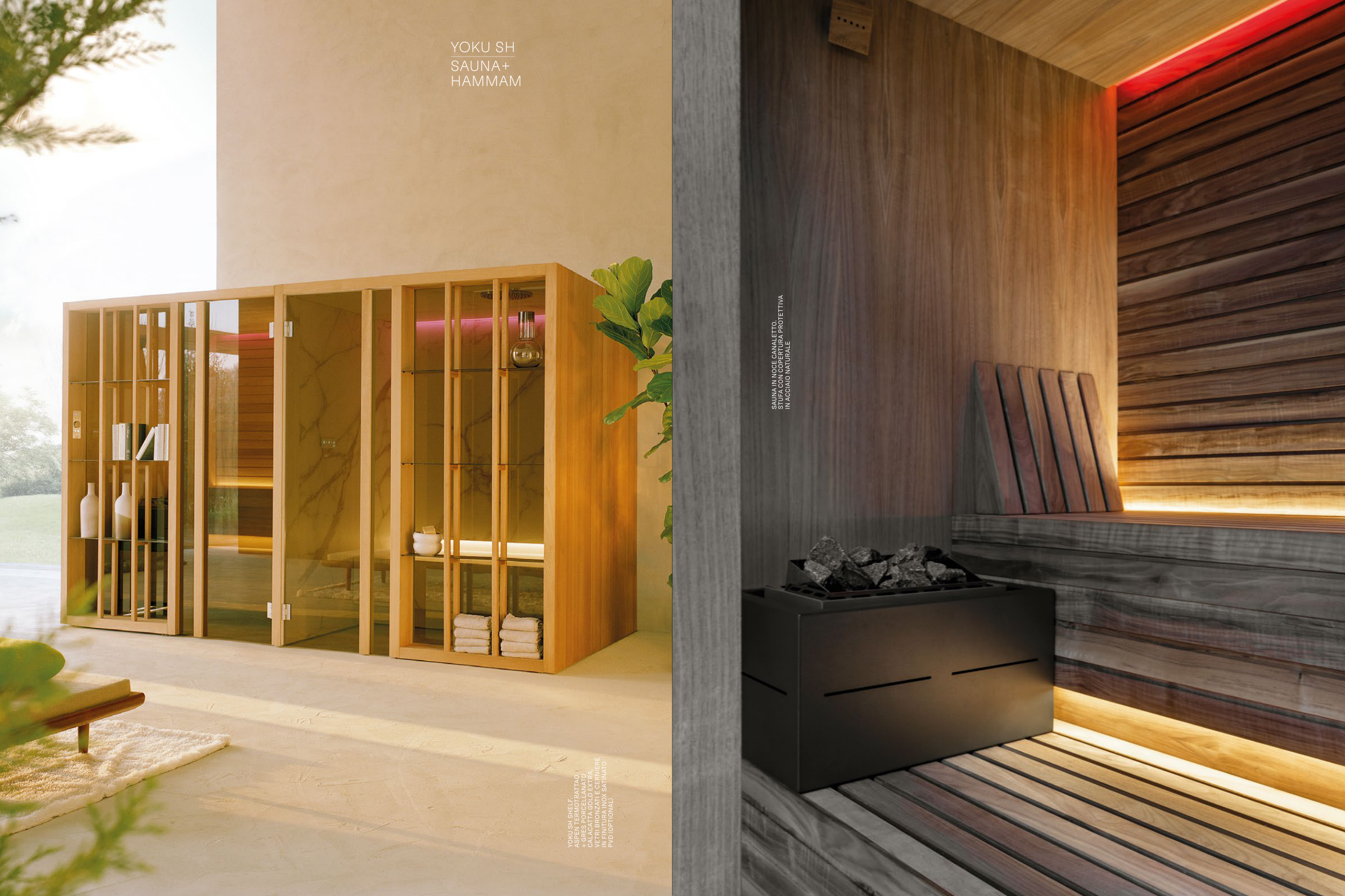YOKU SH SHELF. ASPEN TERMOTRATTAO + GRES PORCELLANATO CALACATTA GOLD EXTRA. VETRI BRONZATI E CERNIERE IN FINITURA INOX SATINATO PVD (OPTIONAL) SAUNA IN NOCE CANALETTO. STUFA CON COPERTURA PROTETTIVA IN ACCIAIO NATURALE YOKU SH SAUNA+ HAMMAM