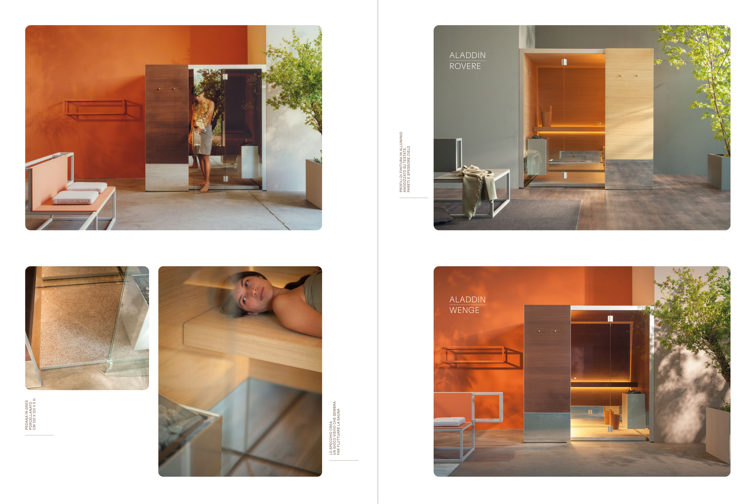 ALADDIN ROVERE ALADDIN WENGE PROFILI DI FINITURA IN ALLUMINIO ANODIZZATO SU TESTATE, PARETI E SPESSORE CIELO LO SPECCHIO CREA UN GIOCO VISIVO CHE SEMBRA FAR FLUTTUARE LA SAUNA PEDANA IN GRES PORCELLANATO CM 120 X 120 X 5 H