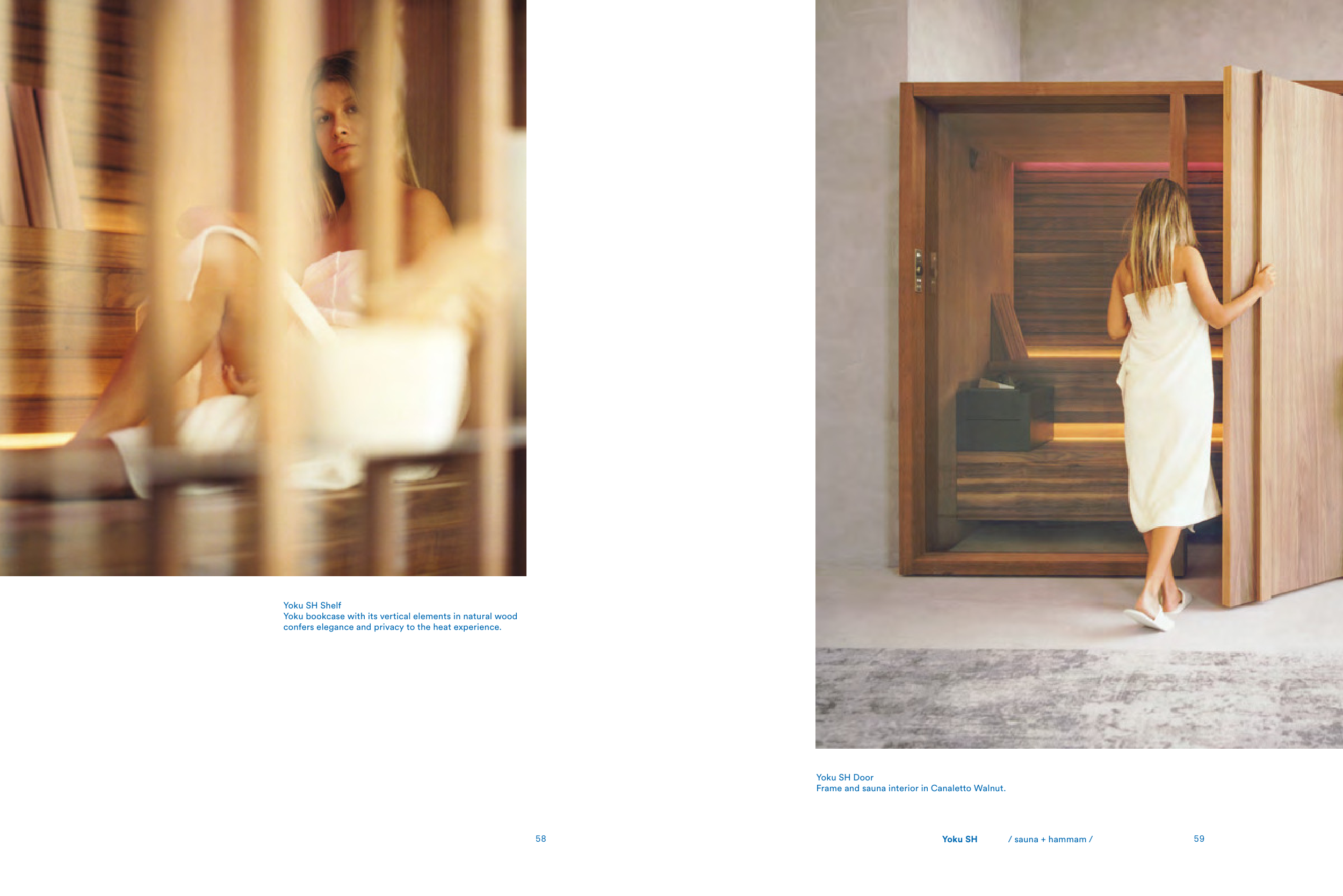 58 59 Yoku SH / sauna + hammam / Yoku SH Door Frame and sauna interior in Canaletto Walnut. Yoku SH Shelf Yoku bookcase with its vertical elements in natural wood confers elegance and privacy to the heat experience.