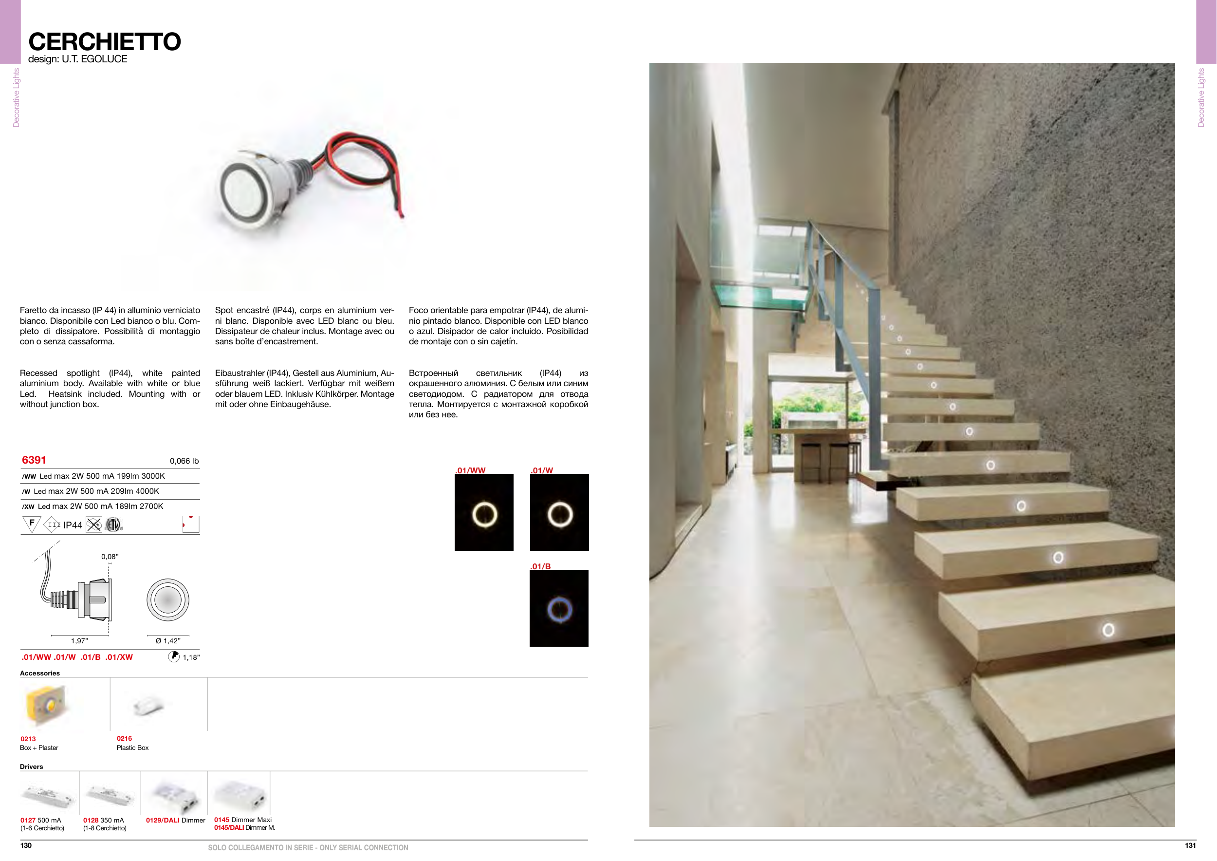 bianco. Disponibile con Led bianco o blu. Com-