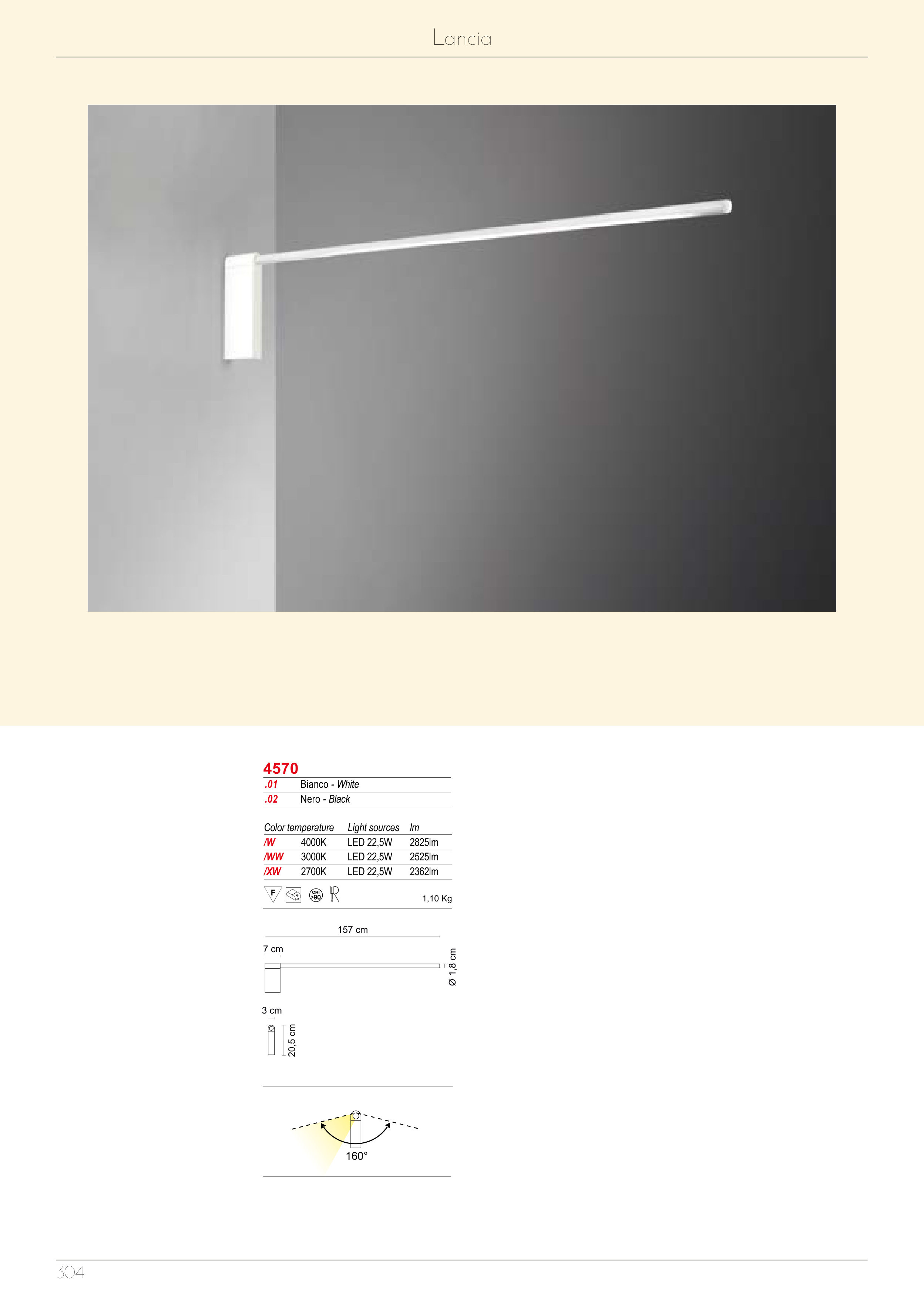 Lancia Tonda 304 160° Ø 1,8 cm 157 cm 20,5 cm 3 cm 7 cm Lancia .01 Bianco - White .02 Nero - Black 4570 Color temperature Light sources lm /W 4000K LED 22,5W 2825lm /WW 3000K LED 22,5W 2525lm /XW 2700K LED 22,5W 2362lm 1,10 Kg