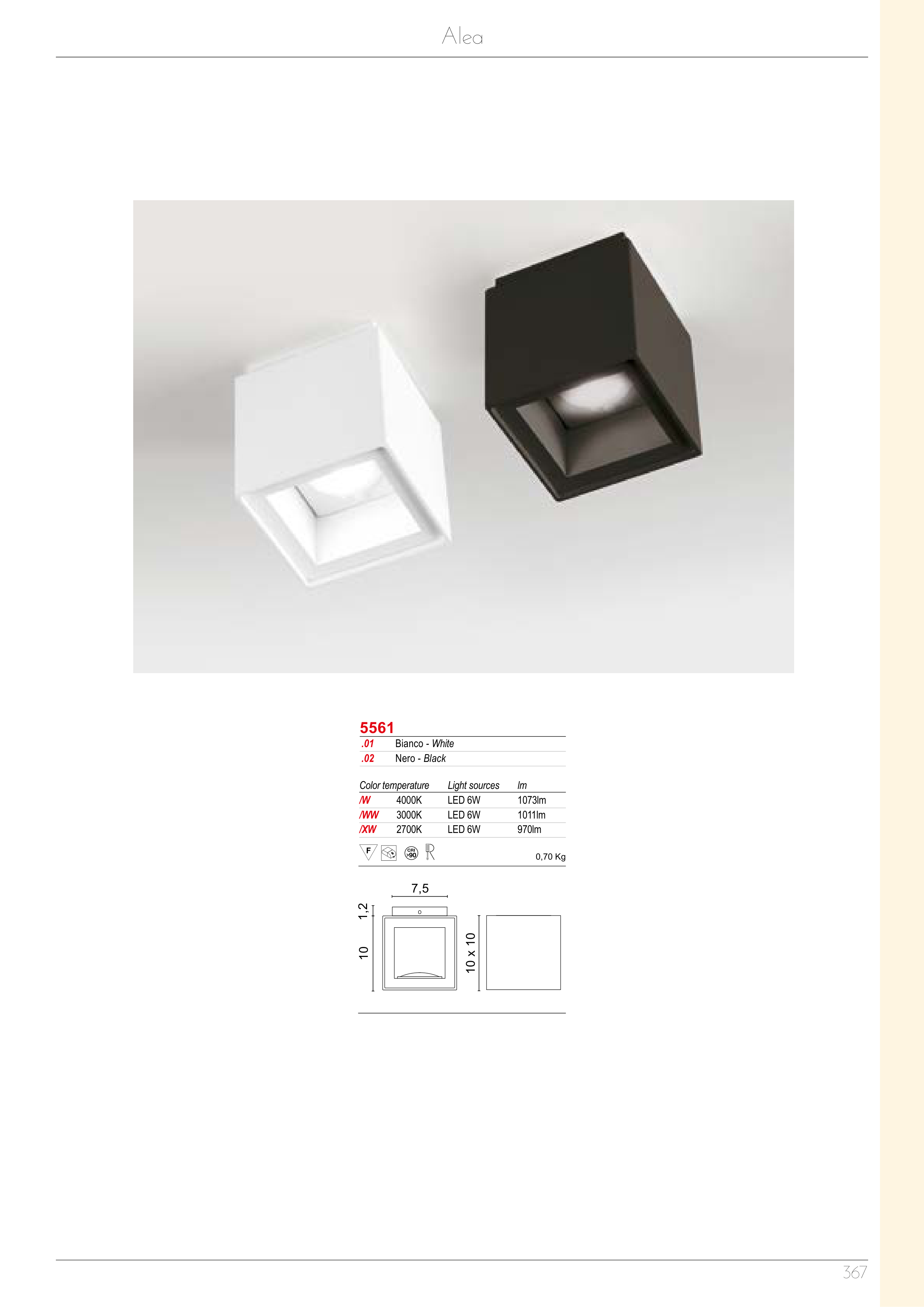 Alea 10 x 10 7,5 10 1,2 .01 Bianco - White .02 Nero - Black 5561 Color temperature Light sources lm /W 4000K LED 6W 1073lm /WW 3000K LED 6W 1011lm /XW 2700K LED 6W 970lm 0,70 Kg