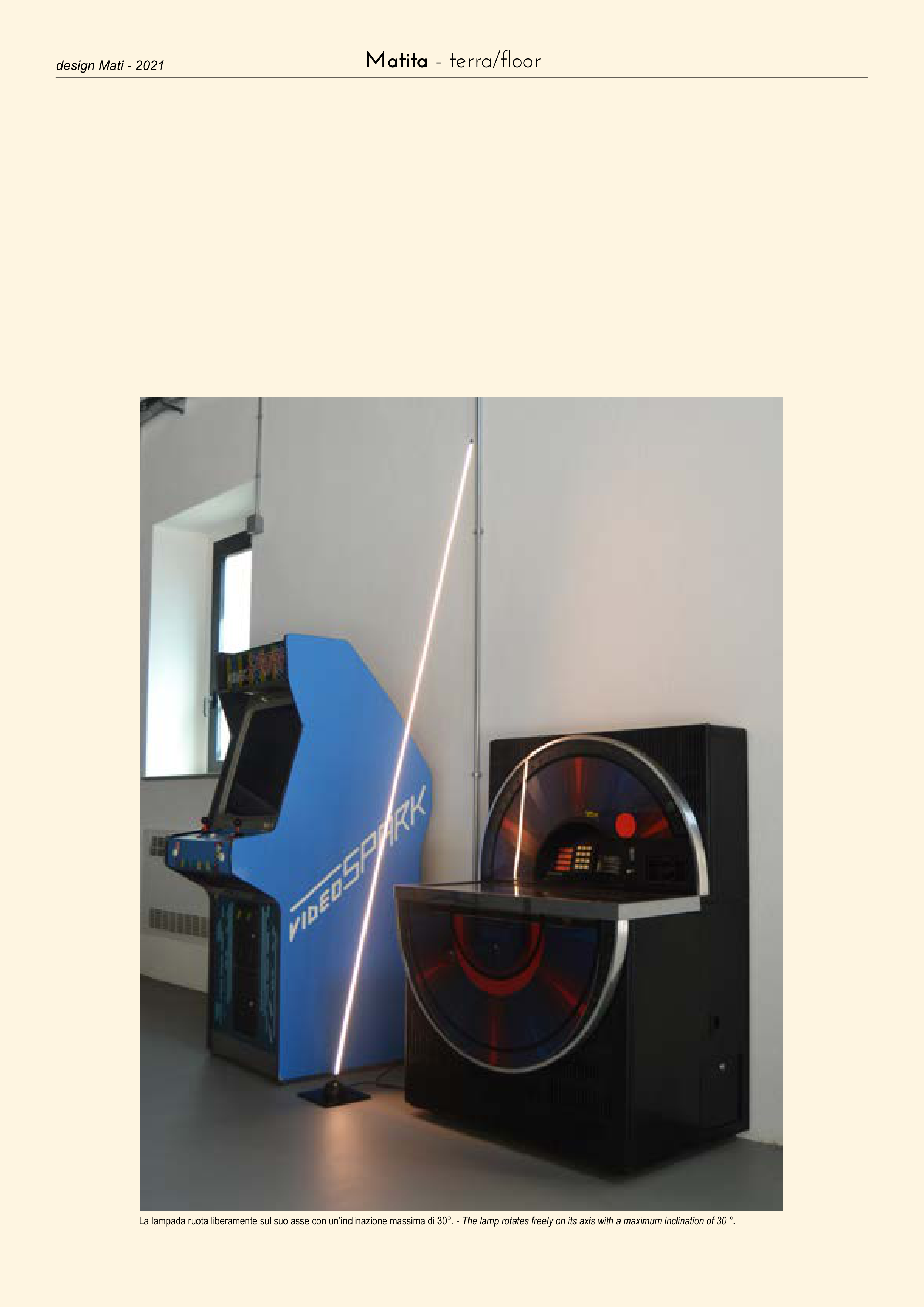 design Mati - 2021 La lampada ruota liberamente sul suo asse con un’inclinazione massima di 30°. - The lamp rotates freely on its axis with a maximum inclination of 30 °. Matita - terra/floor
