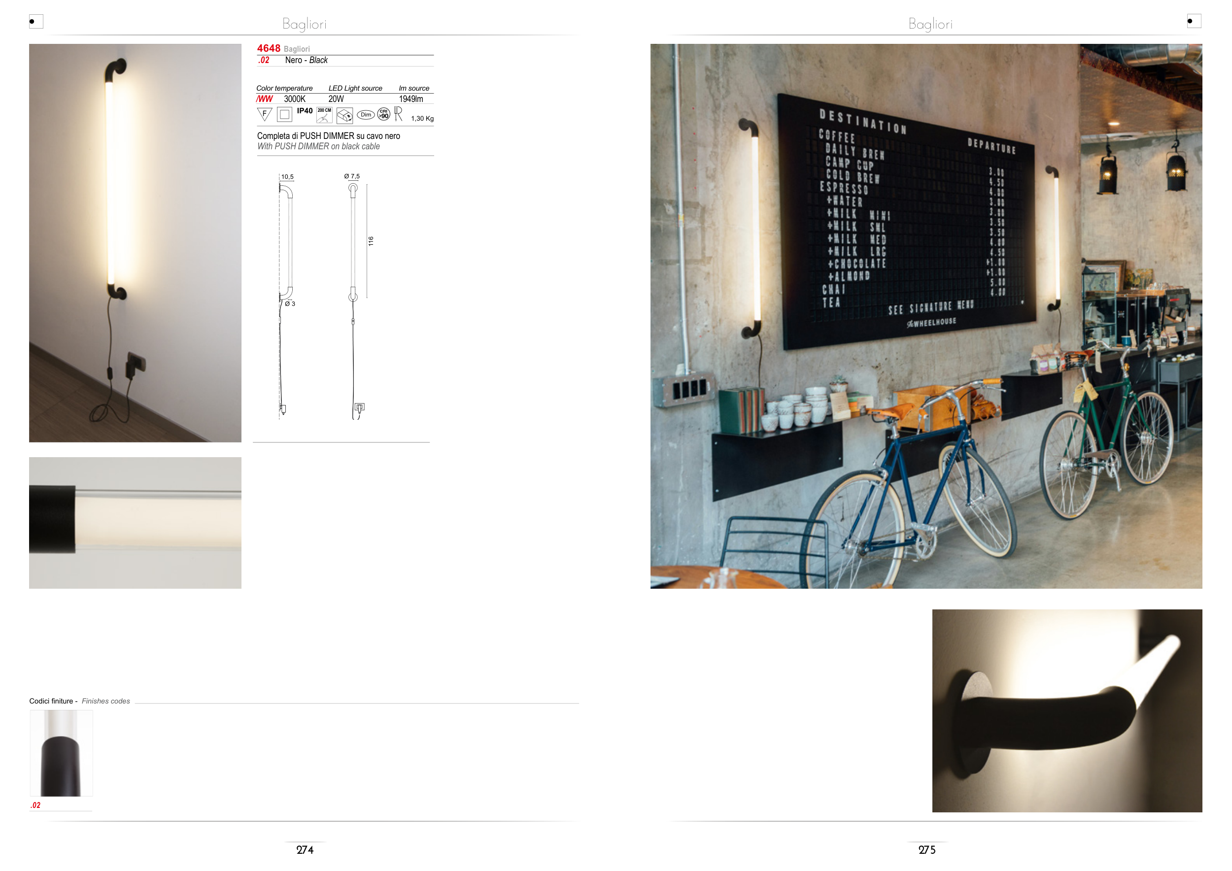 275 274 Bagliori Bagliori .02 Nero - Black 1,30 Kg 4648 Bagliori Color temperature LED Light source lm source /WW 3000K 20W 1949lm IP40 .02 Codici finiture - Finishes codes Completa di PUSH DIMMER su cavo nero With PUSH DIMMER on black cable 116 Ø 7,5 10,5 Ø 3 200 CM