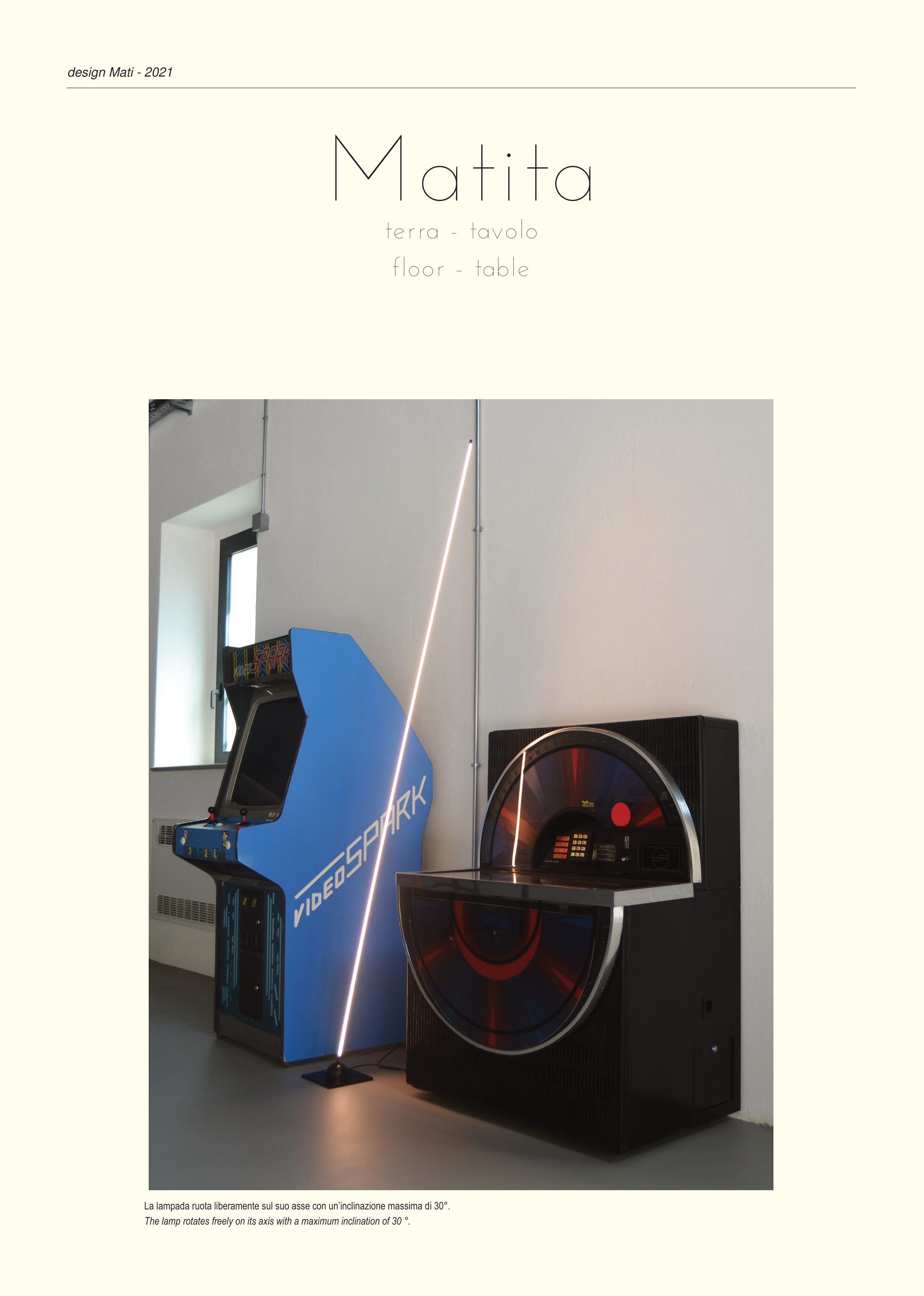 design Mati - 2021 Matita terra - tavolo floor - table La lampada ruota liberamente sul suo asse con un’inclinazione massima di 30°. The lamp rotates freely on its axis with a maximum inclination of 30 °.