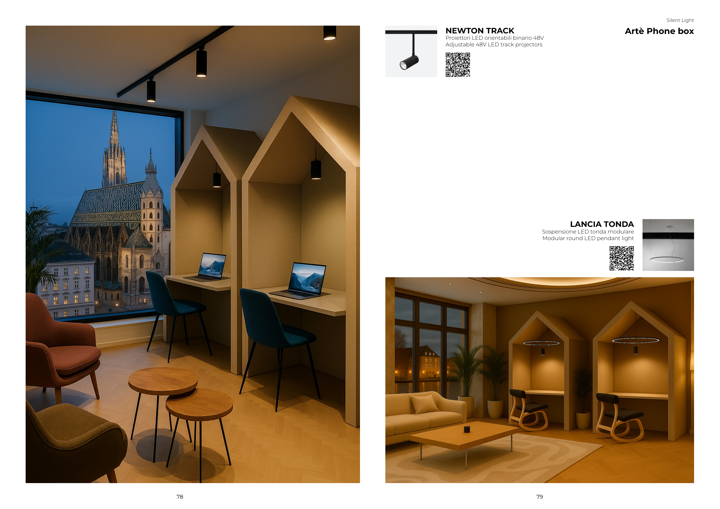 79 78 Silent Light Artè Phone box NEWTON TRACK Proiettori LED orientabili binario 48V Adjustable 48V LED track projectors LANCIA TONDA Sospensione LED tonda modulare Modular round LED pendant light