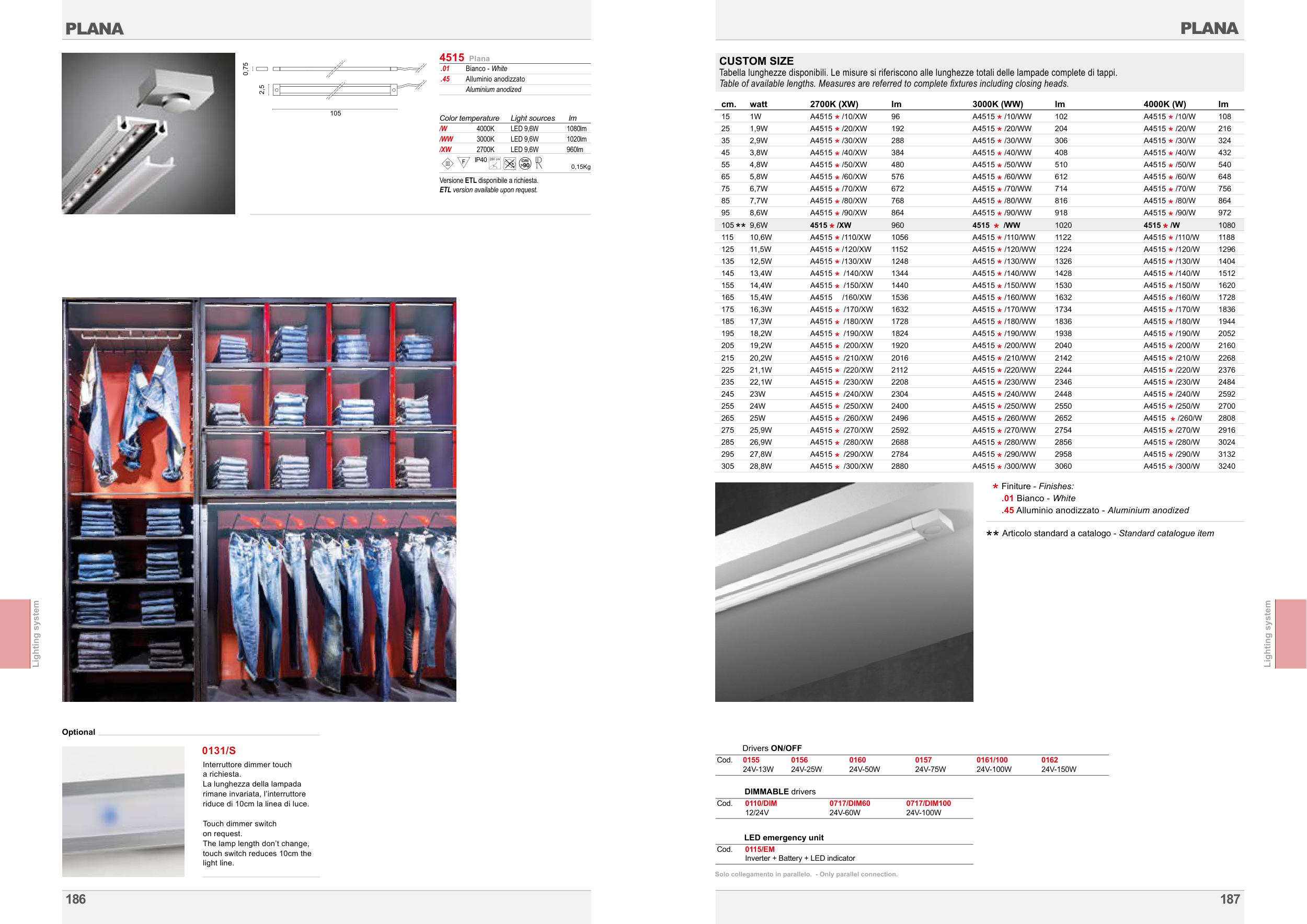 Table of available lengths. Measures are referred to complete fixtures including closing heads.