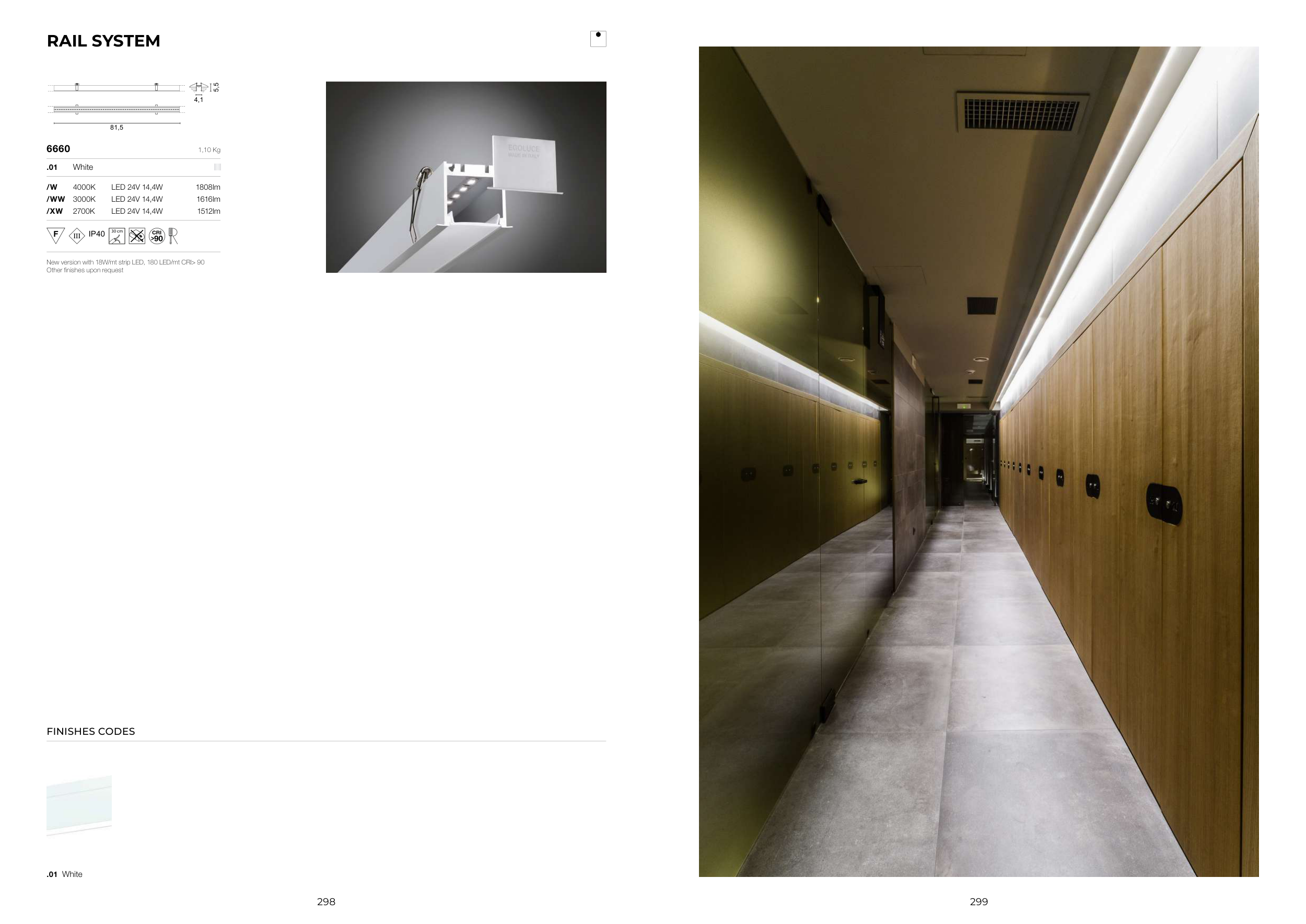 1,10 Kg .01 White /W 4000K LED 24V 14,4W 1808lm /WW 3000K LED 24V 14,4W 1616lm /XW 2700K LED 24V 14,4W 1512lm 30 cm 81,5 5,5 4,1 FINISHES CODES New version with 18W/mt strip LED, 180 LED/mt CRI> 90 Other finishes upon request .01 White