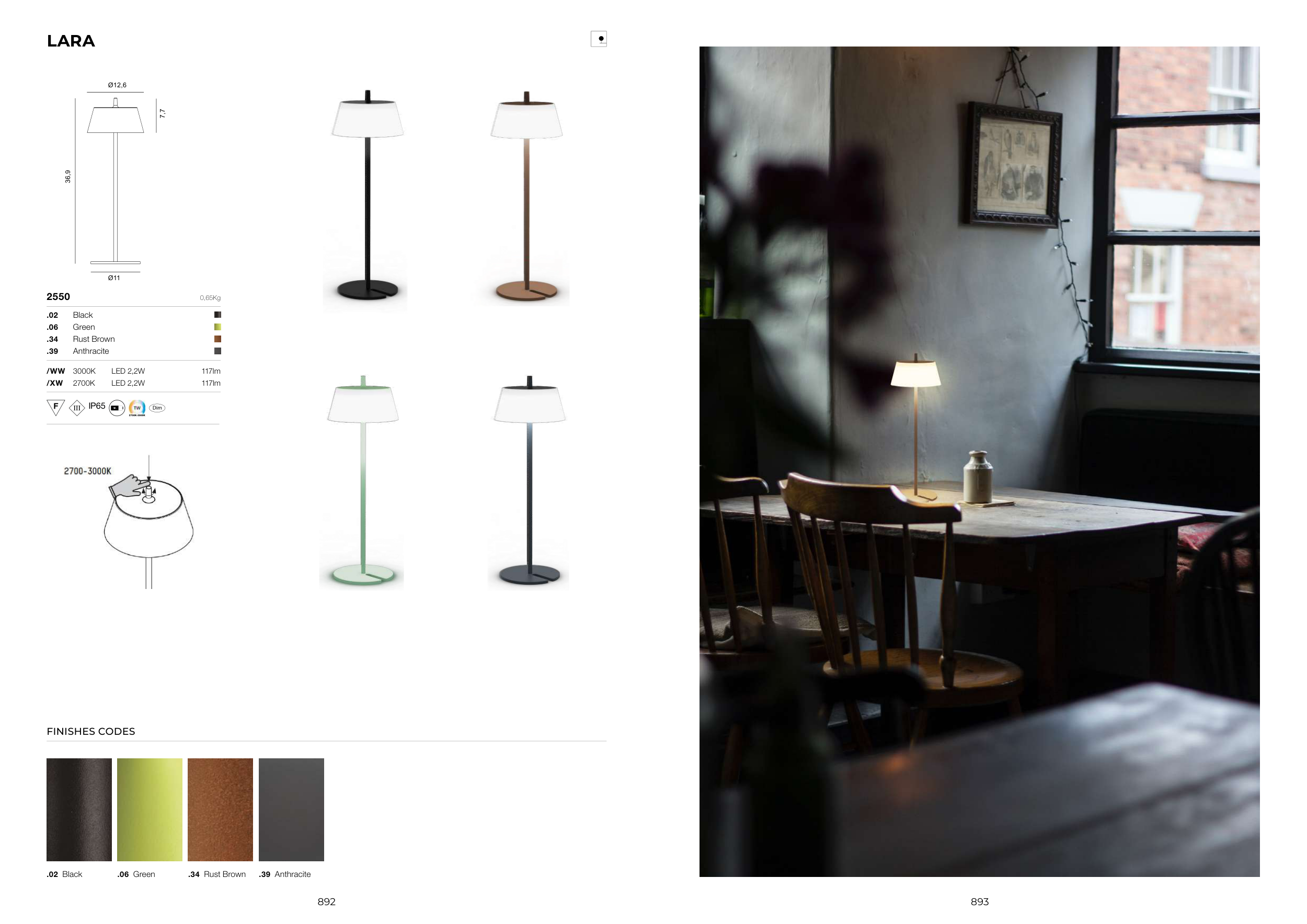 892 893 2550 0,65Kg .02 Black .06 Green .34 Rust Brown .39 Anthracite /WW 3000K LED 2,2W 117lm /XW 2700K LED 2,2W 117lm LARA FINISHES CODES .02 Black .34 Rust Brown .06 Green .39 Anthracite Ø12,6 Ø11 7,7 36,9