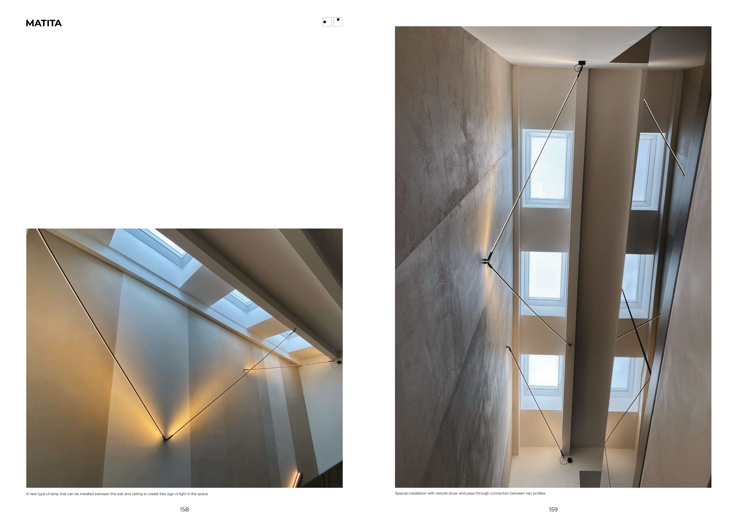 158 159 MATITA Special installation with remote driver and pass-through connection between two profiles. A new type of lamp that can be installed between the wall and ceiling to create free sign of light in the space