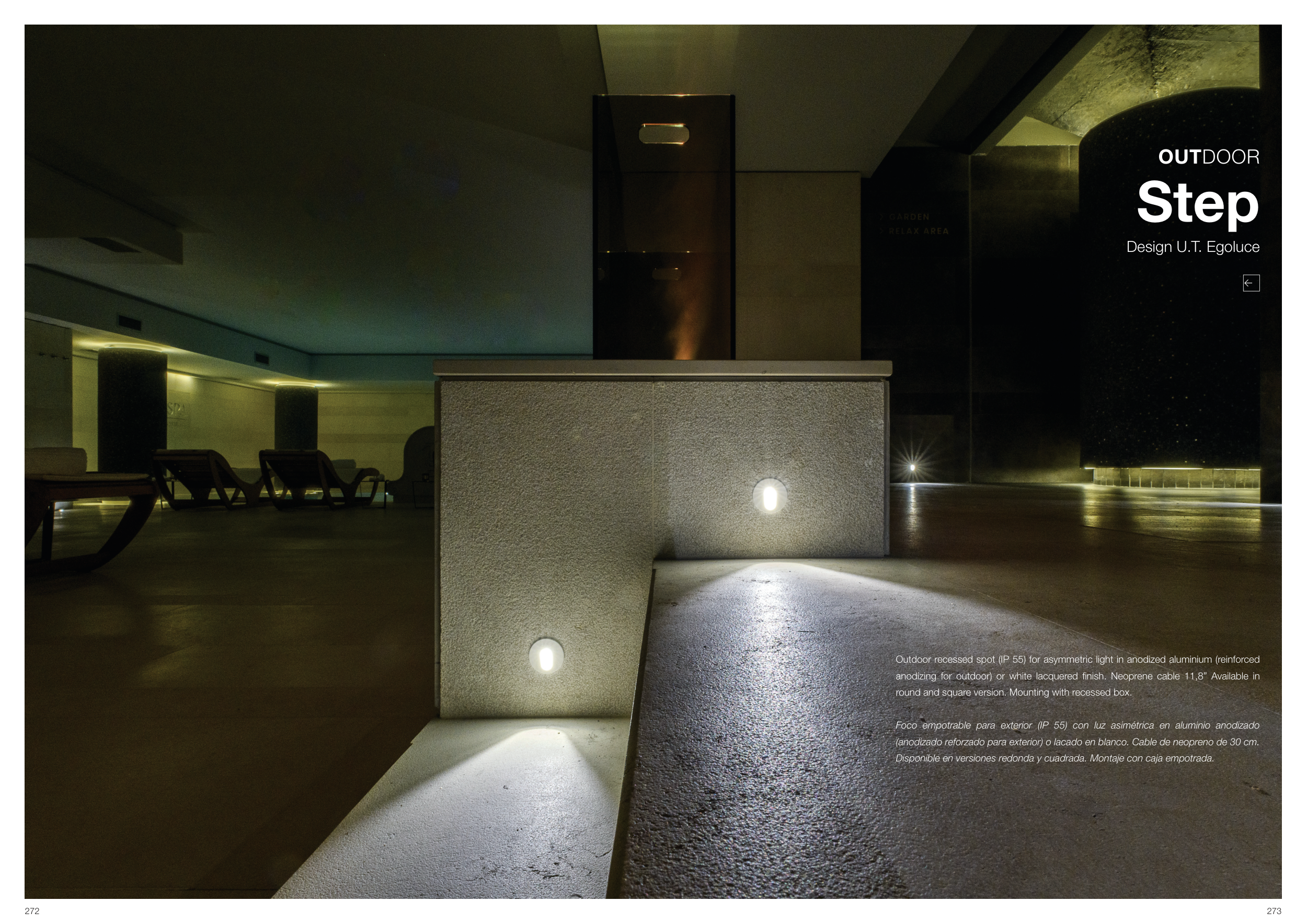 Disponible en versiones redonda y cuadrada. Montaje con caja empotrada.