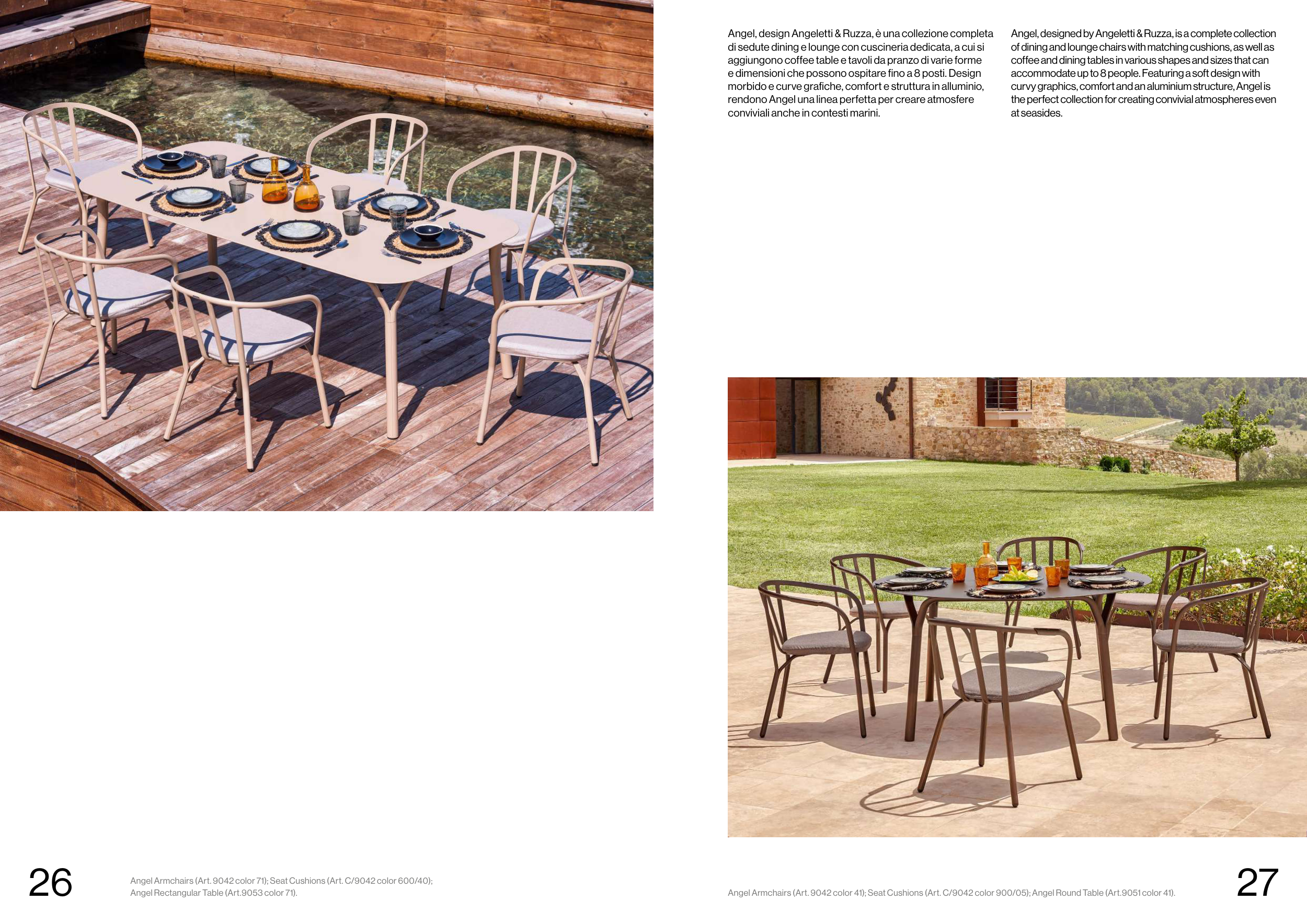 Angel Armchairs (Art. 9042 color 41); Seat Cushions (Art. C/9042 color 900/05); Angel Round Table (Art.9051 color 41).