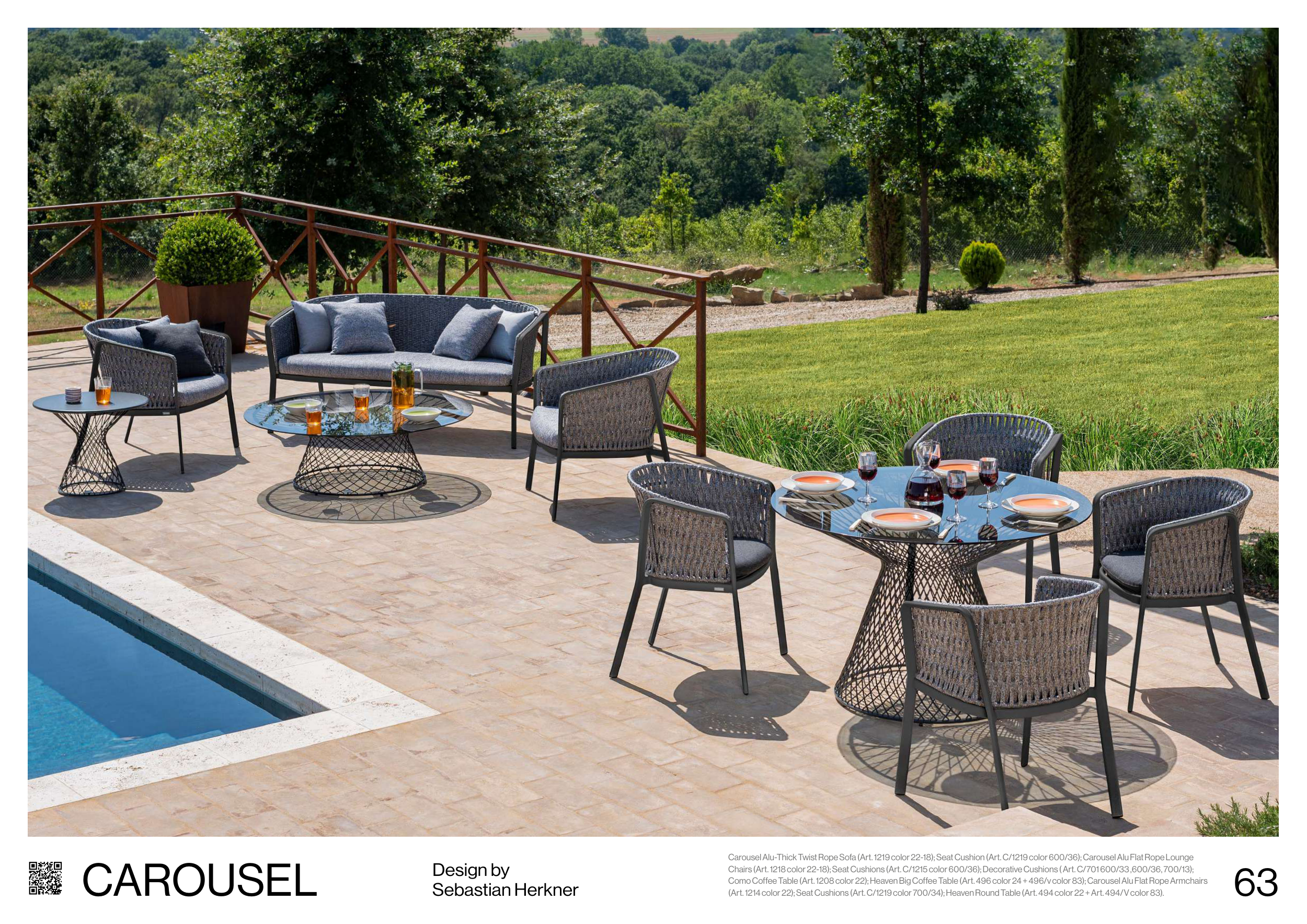 Como Coffee Table (Art. 1208 color 22); Heaven Big Coffee Table (Art. 496 color 24 + 496/v color 83); Carousel Alu Flat Rope Armchairs