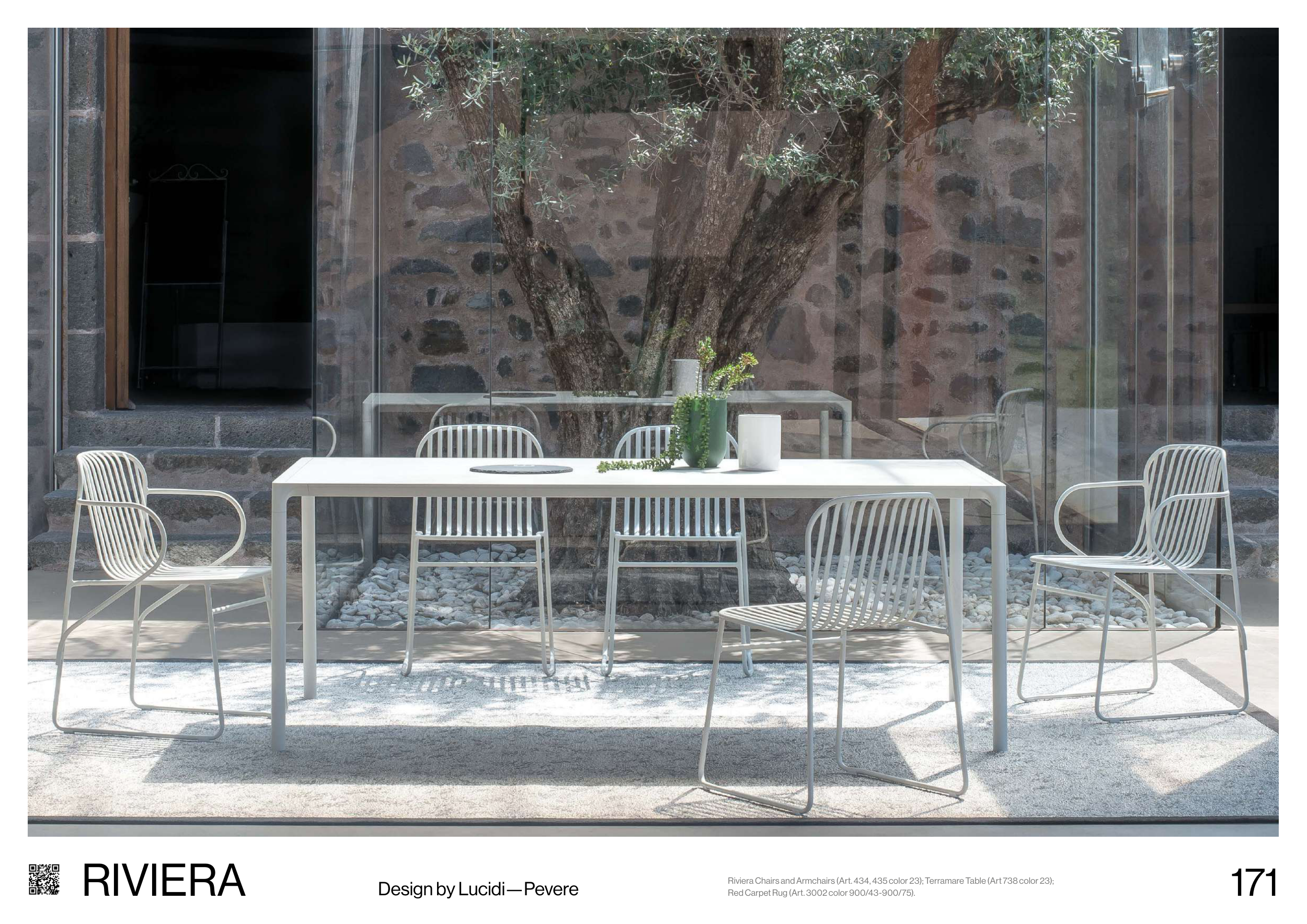 171 RIVIERA Design by Lucidi—Pevere Riviera Chairs and Armchairs (Art. 434, 435 color 23); Terramare Table (Art 738 color 23); Red Carpet Rug (Art. 3002 color 900/43-900/75).