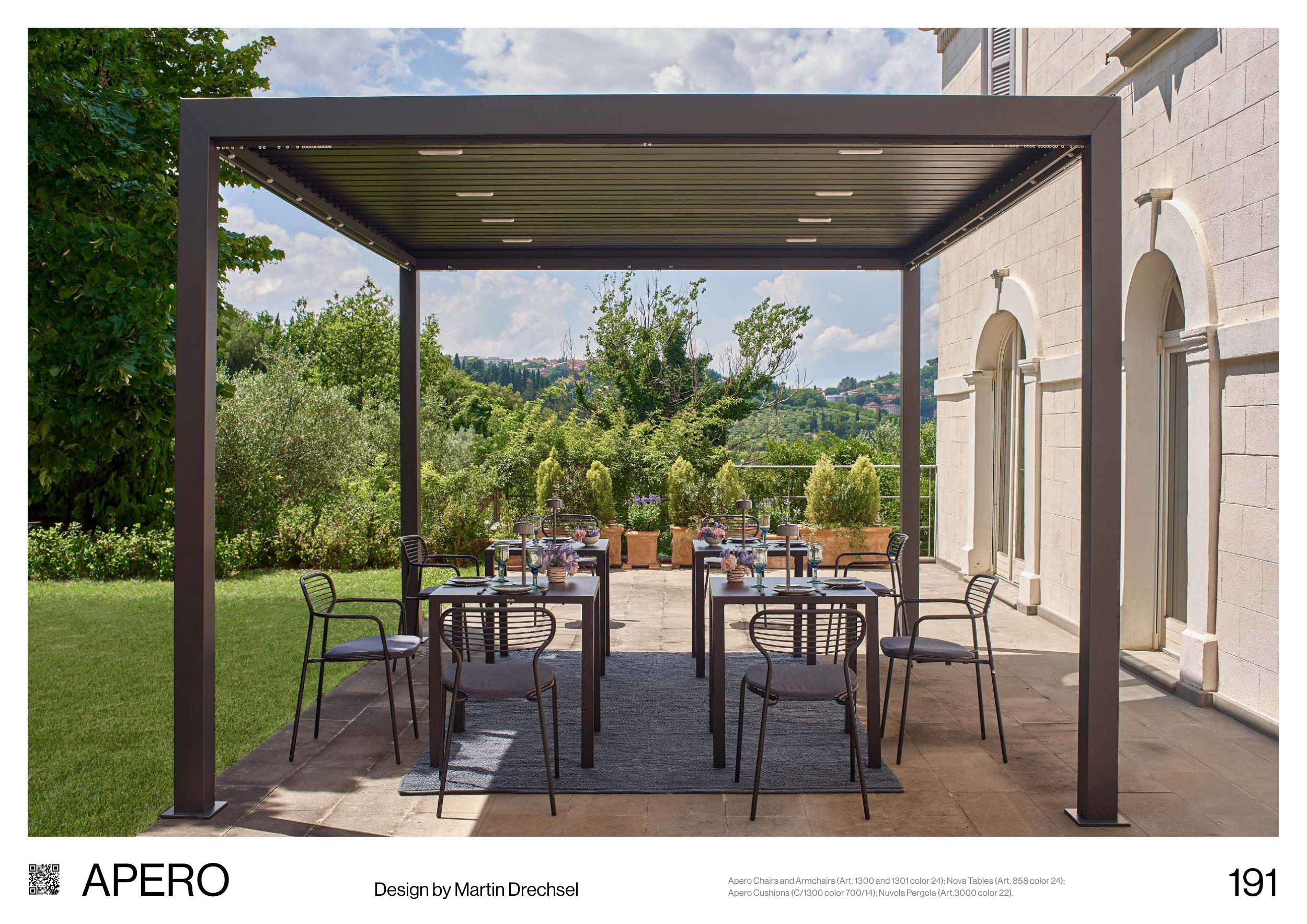 APERO Design by Martin Drechsel Apero Chairs and Armchairs (Art. 1300 and 1301 color 24); Nova Tables (Art. 858 color 24); Apero Cushions (C/1300 color 700/14); Nuvola Pergola (Art.3000 color 22). 191