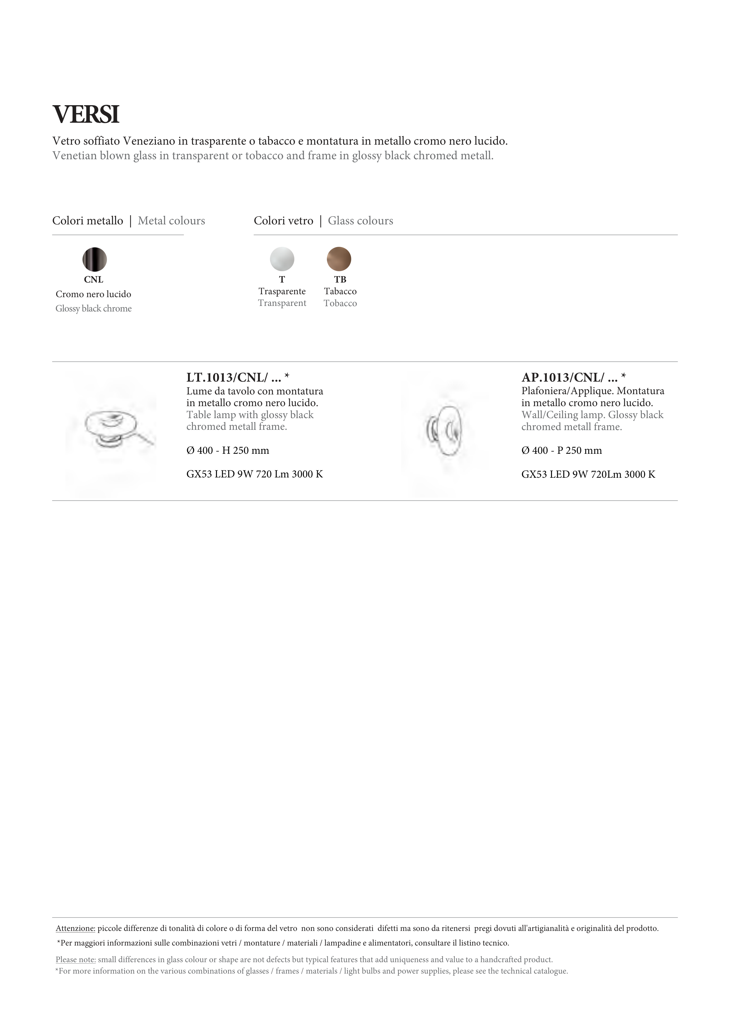 *Per maggiori informazioni sulle combinazioni vetri / montature / materiali / lampadine e alimentatori, consultare il listino tecnico.