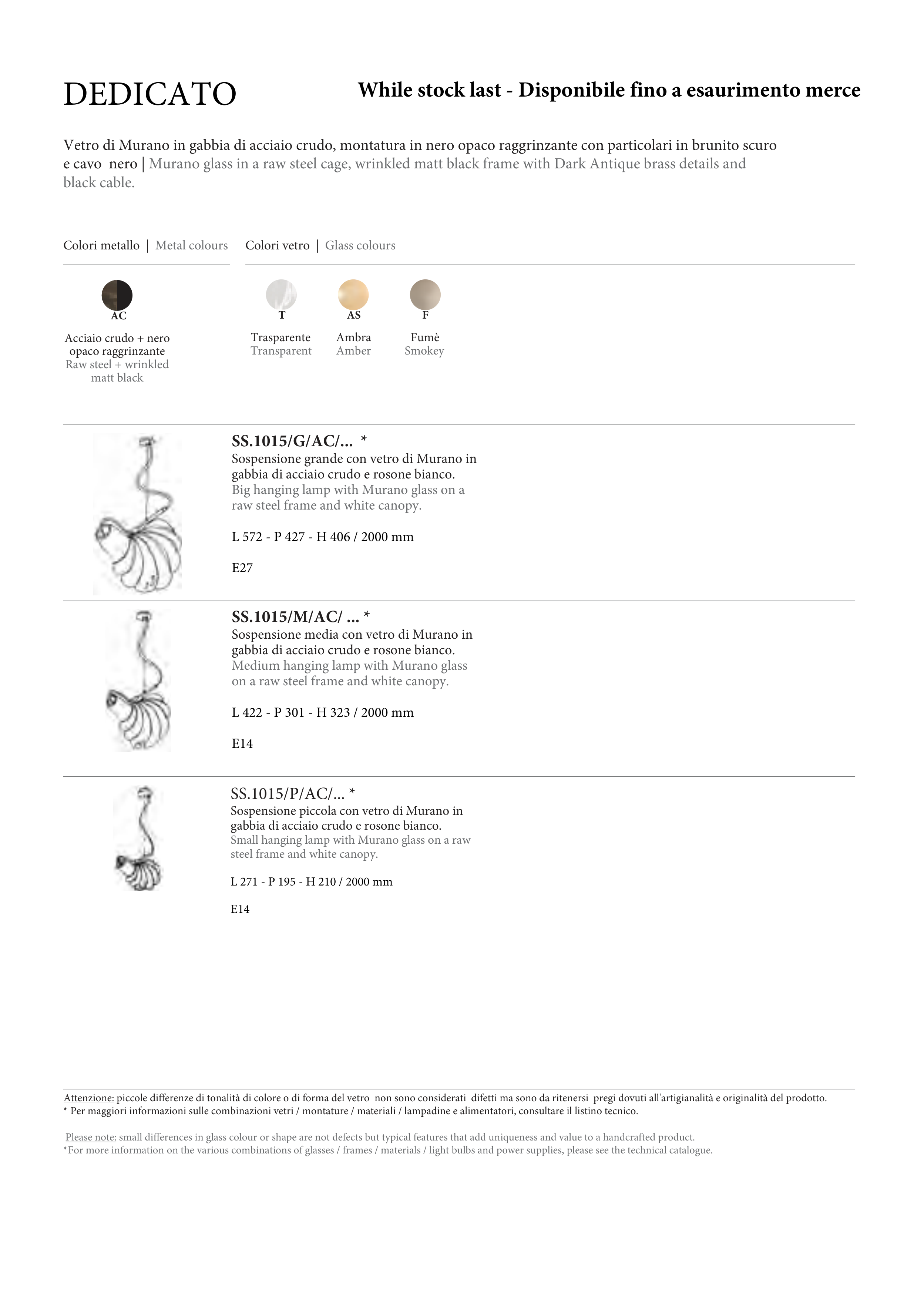 * Per maggiori informazioni sulle combinazioni vetri / montature / materiali / lampadine e alimentatori, consultare il listino tecnico.