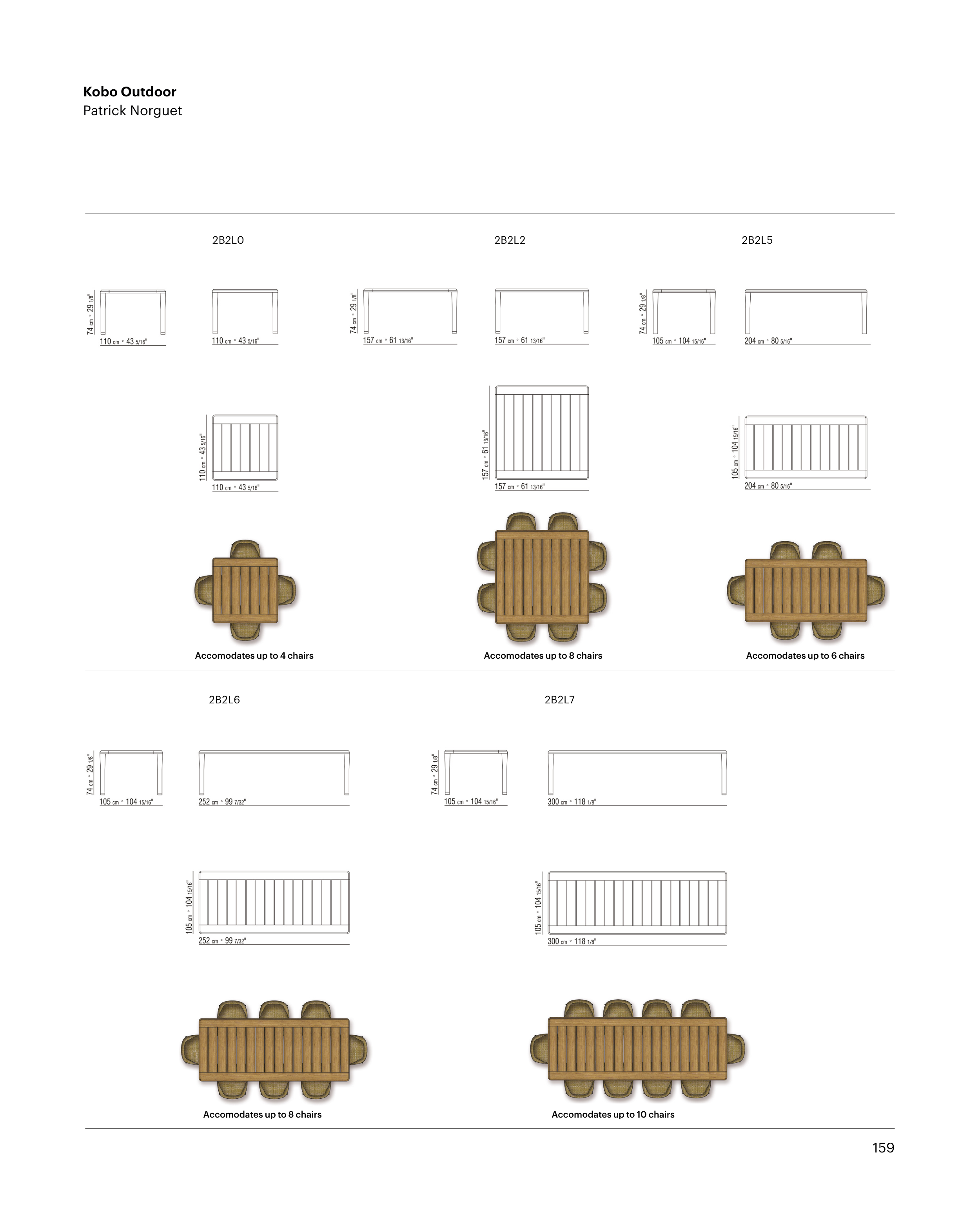 159 Accomodates up to 8 chairs Accomodates up to 10 chairs Kobo Outdoor Patrick Norguet 2B2L6 2B2L7 2B2L0 2B2L2 2B2L5 Accomodates up to 8 chairs Accomodates up to 6 chairs Accomodates up to 4 chairs