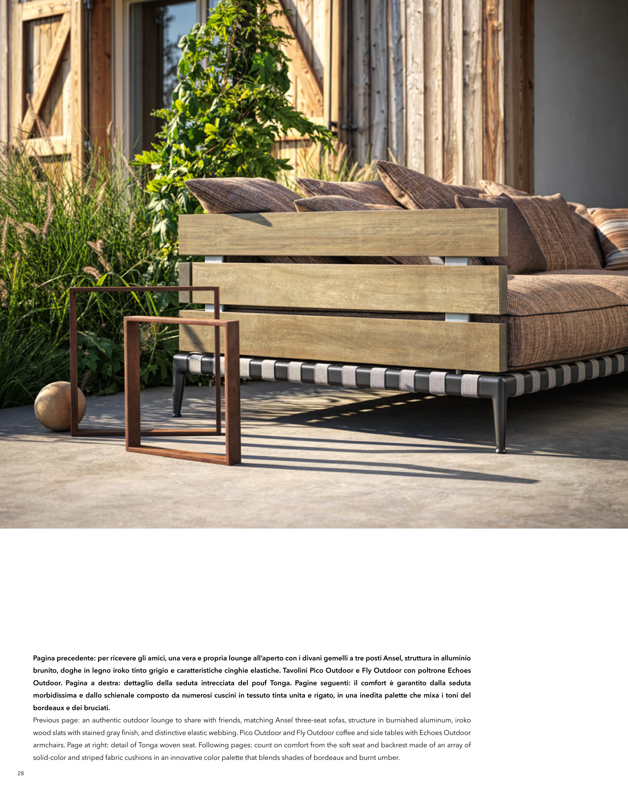 Previous page: an authentic outdoor lounge to share with friends, matching Ansel three-seat sofas, structure in burnished aluminum, iroko