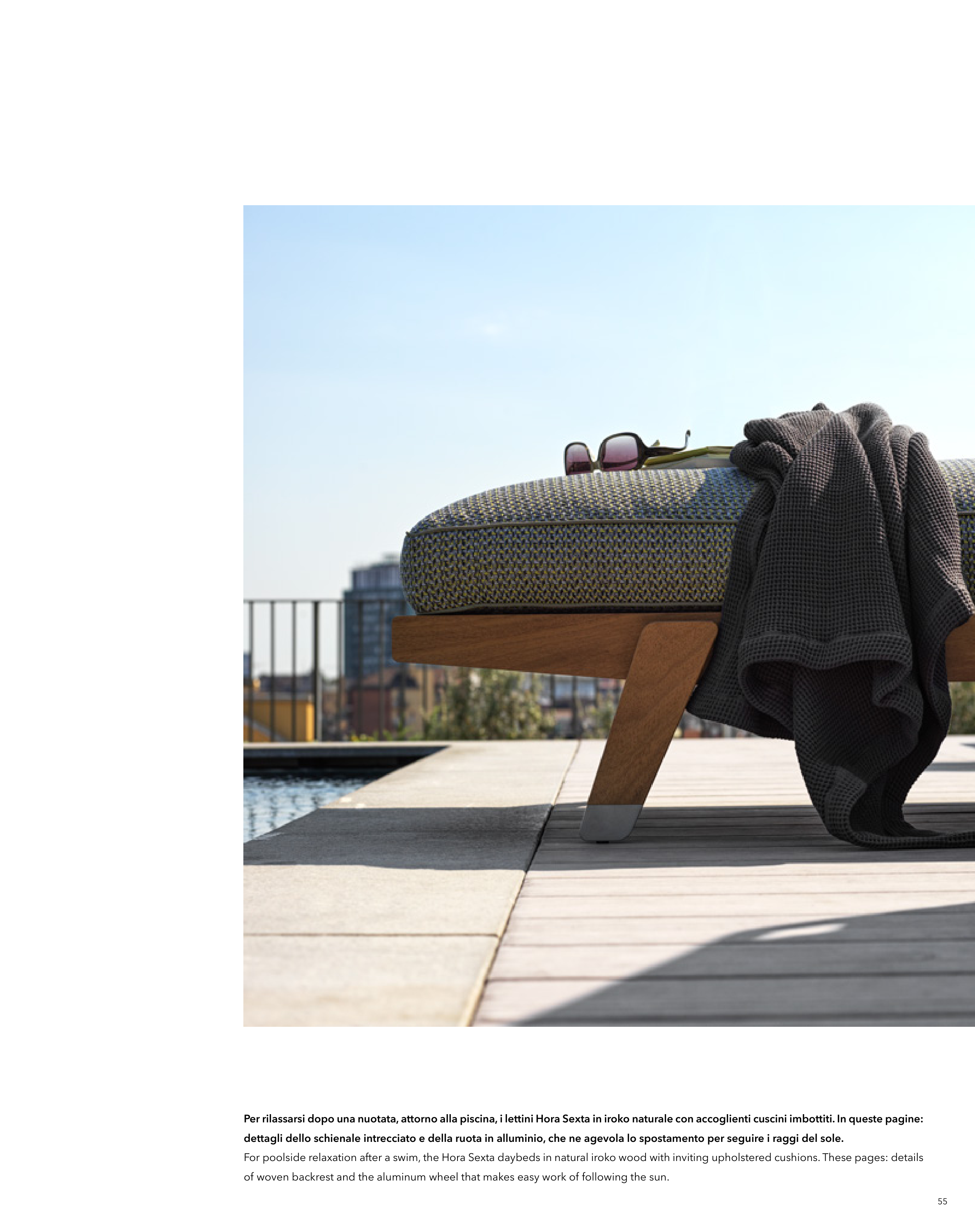Per rilassarsi dopo una nuotata, attorno alla piscina, i lettini Hora Sexta in iroko naturale con accoglienti cuscini imbottiti. In queste pagine: