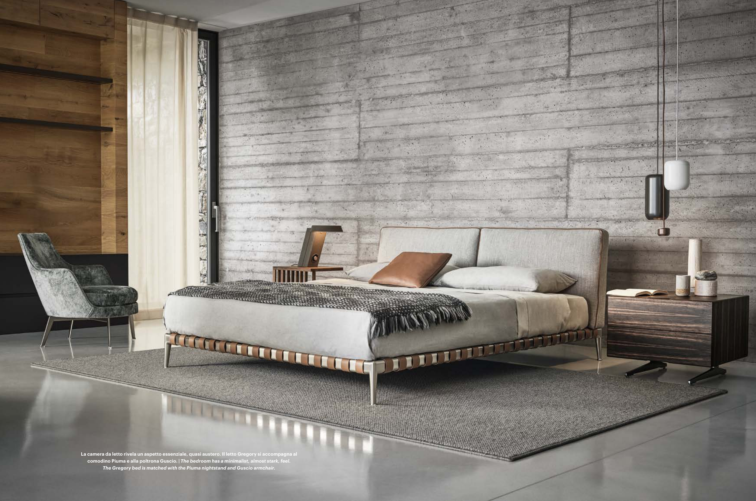 The Gregory bed is matched with the Piuma nightstand and Guscio armchair.