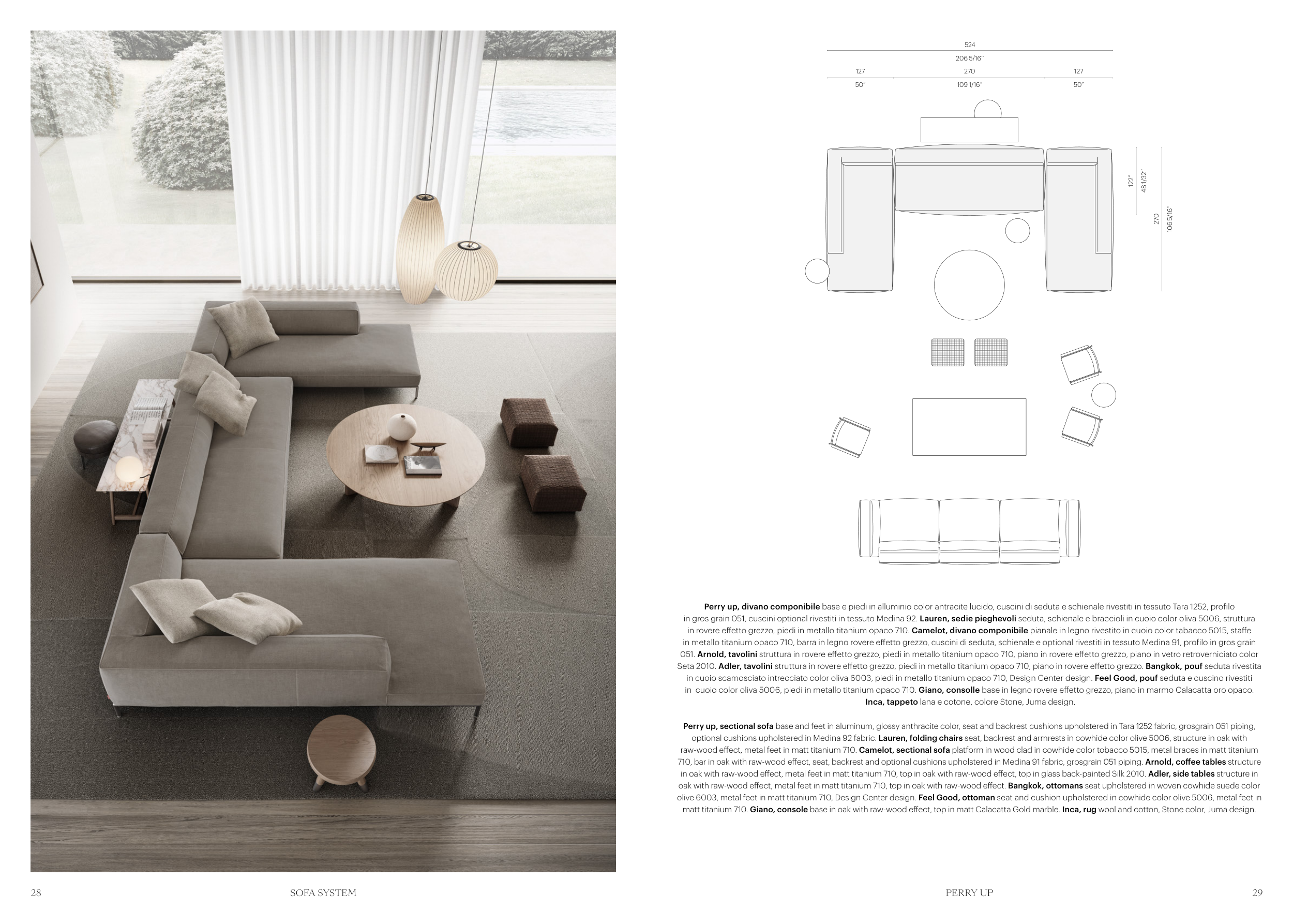 oak with raw-wood effect, metal feet in matt titanium 710, top in oak with raw-wood effect. Bangkok, ottomans seat upholstered in woven cowhide suede color