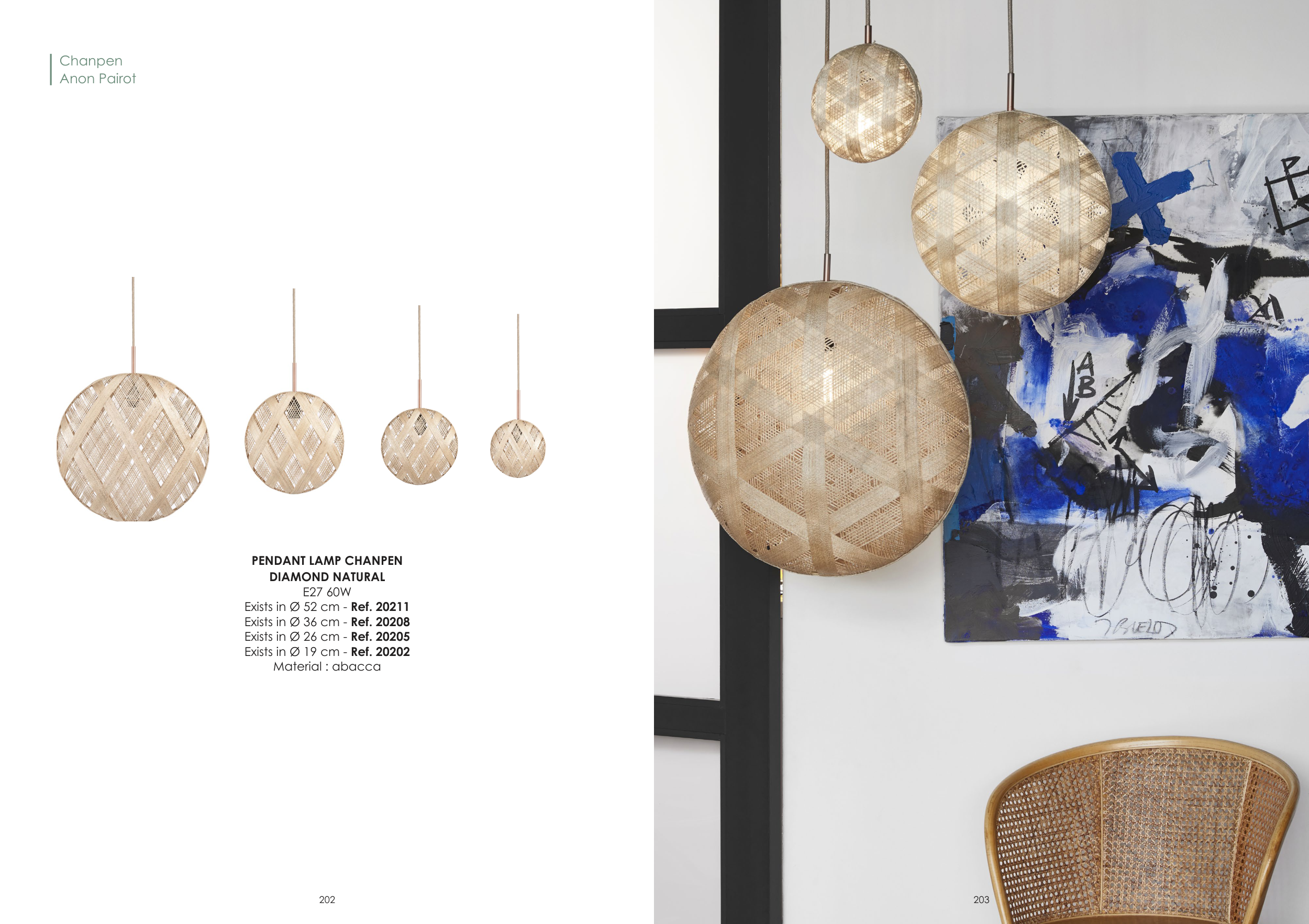 PENDANT LAMP CHANPEN DIAMOND NATURAL E27 60W Exists in Ø 52 cm - Ref. 20211 Exists in Ø 36 cm - Ref. 20208 Exists in Ø 26 cm - Ref. 20205 Exists in Ø 19 cm - Ref. 20202 Material : abacca Chanpen Anon Pairot 202 203
