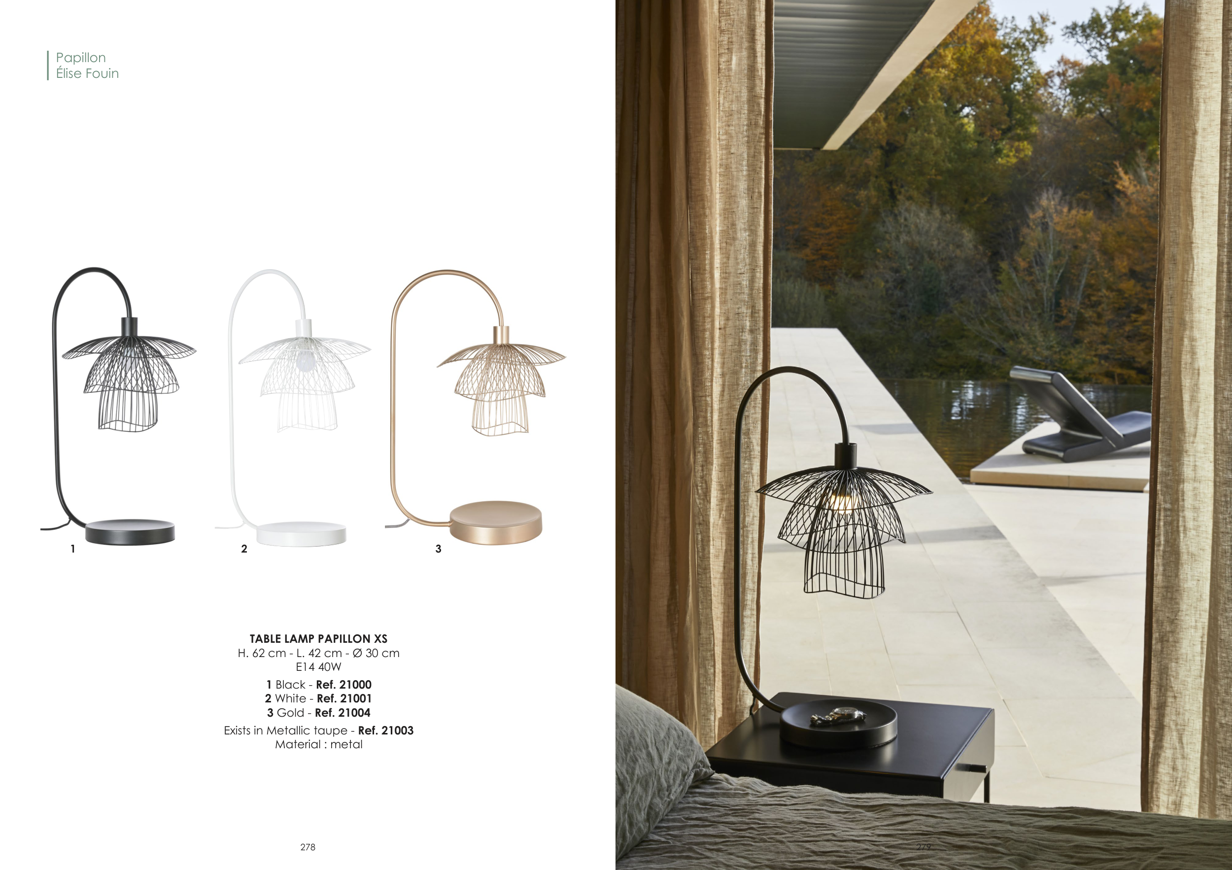 Papillon Élise Fouin TABLE LAMP PAPILLON XS H. 62 cm - L. 42 cm - Ø 30 cm E14 40W 1 Black - Ref. 21000 2 White - Ref. 21001 3 Gold - Ref. 21004 Exists in Metallic taupe - Ref. 21003 Material : metal 1 2 3 278 279