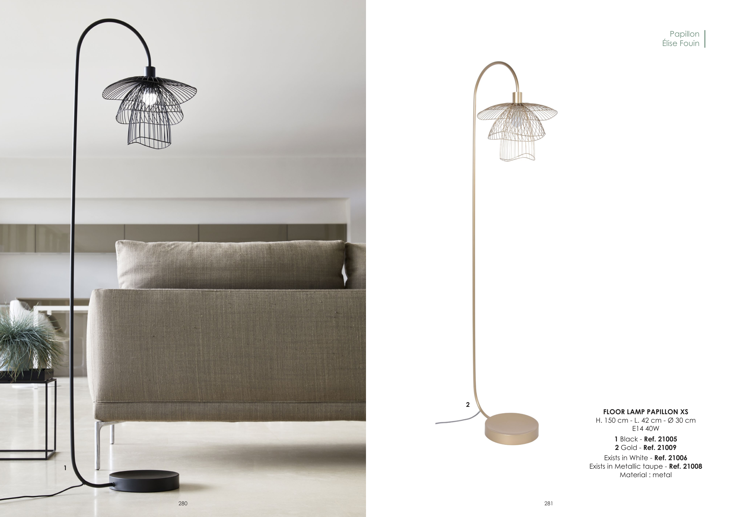 Papillon Élise Fouin FLOOR LAMP PAPILLON XS H. 150 cm - L. 42 cm - Ø 30 cm E14 40W 1 Black - Ref. 21005 2 Gold - Ref. 21009 Exists in White - Ref. 21006 Exists in Metallic taupe - Ref. 21008 Material : metal 2 1 280 281