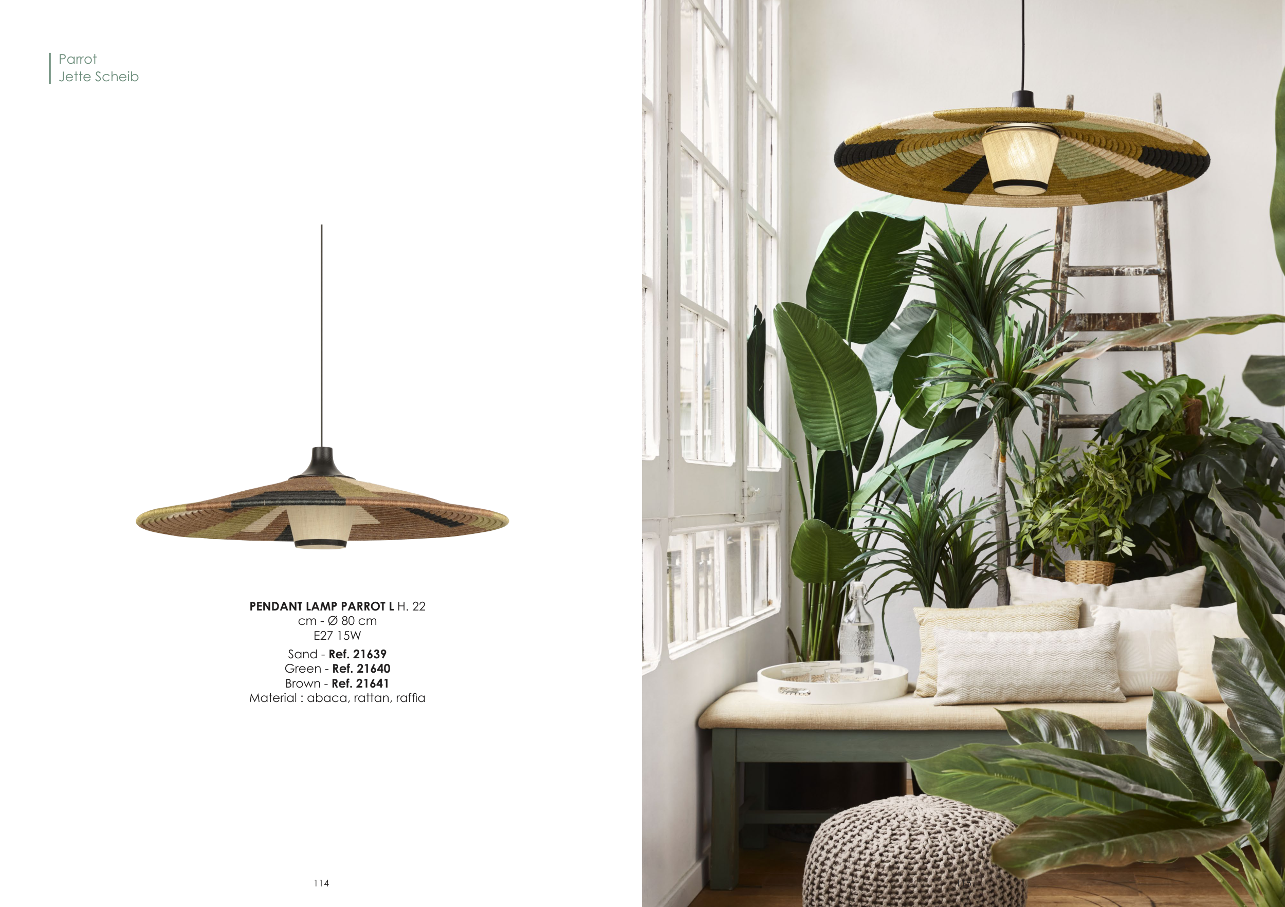 Parrot Jette Scheib PENDANT LAMP PARROT L H. 22 cm - Ø 80 cm E27 15W Sand - Ref. 21639 Green - Ref. 21640 Brown - Ref. 21641 Material : abaca, rattan, raffia 114 115