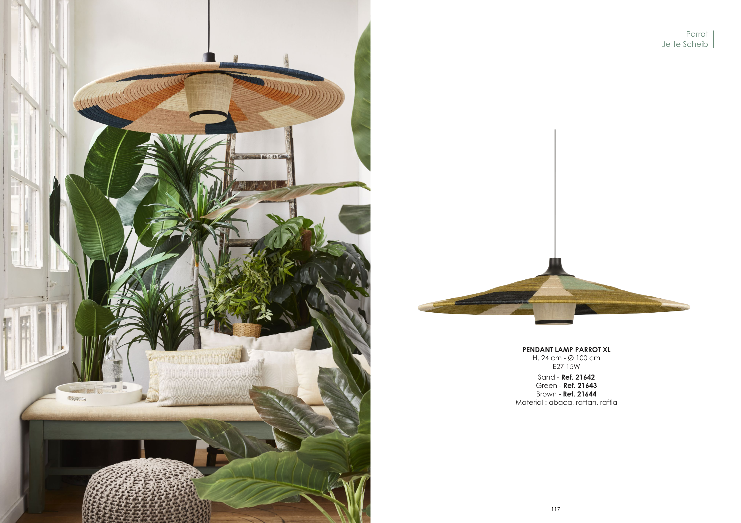 PENDANT LAMP PARROT XL H. 24 cm - Ø 100 cm E27 15W Sand - Ref. 21642 Green - Ref. 21643 Brown - Ref. 21644 Material : abaca, rattan, raffia Parrot Jette Scheib 116 117