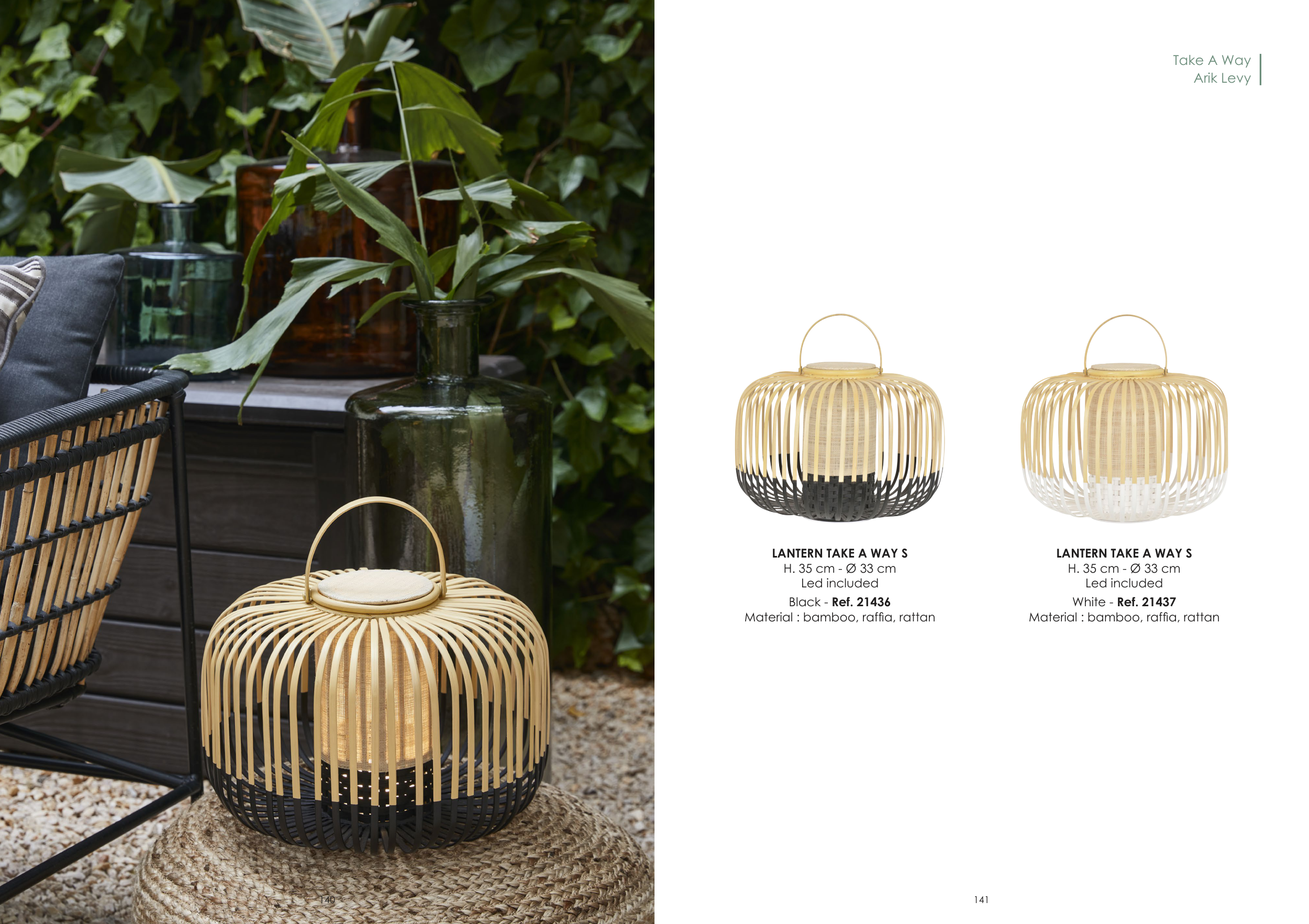 Take A Way Arik Levy LANTERN TAKE A WAY S H. 35 cm - Ø 33 cm Led included Black - Ref. 21436 Material : bamboo, raffia, rattan LANTERN TAKE A WAY S H. 35 cm - Ø 33 cm Led included White - Ref. 21437 Material : bamboo, raffia, rattan 140 141